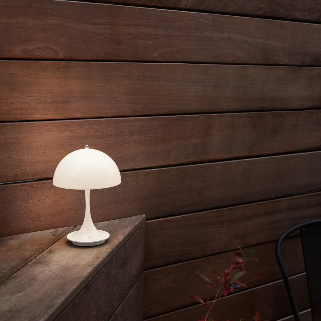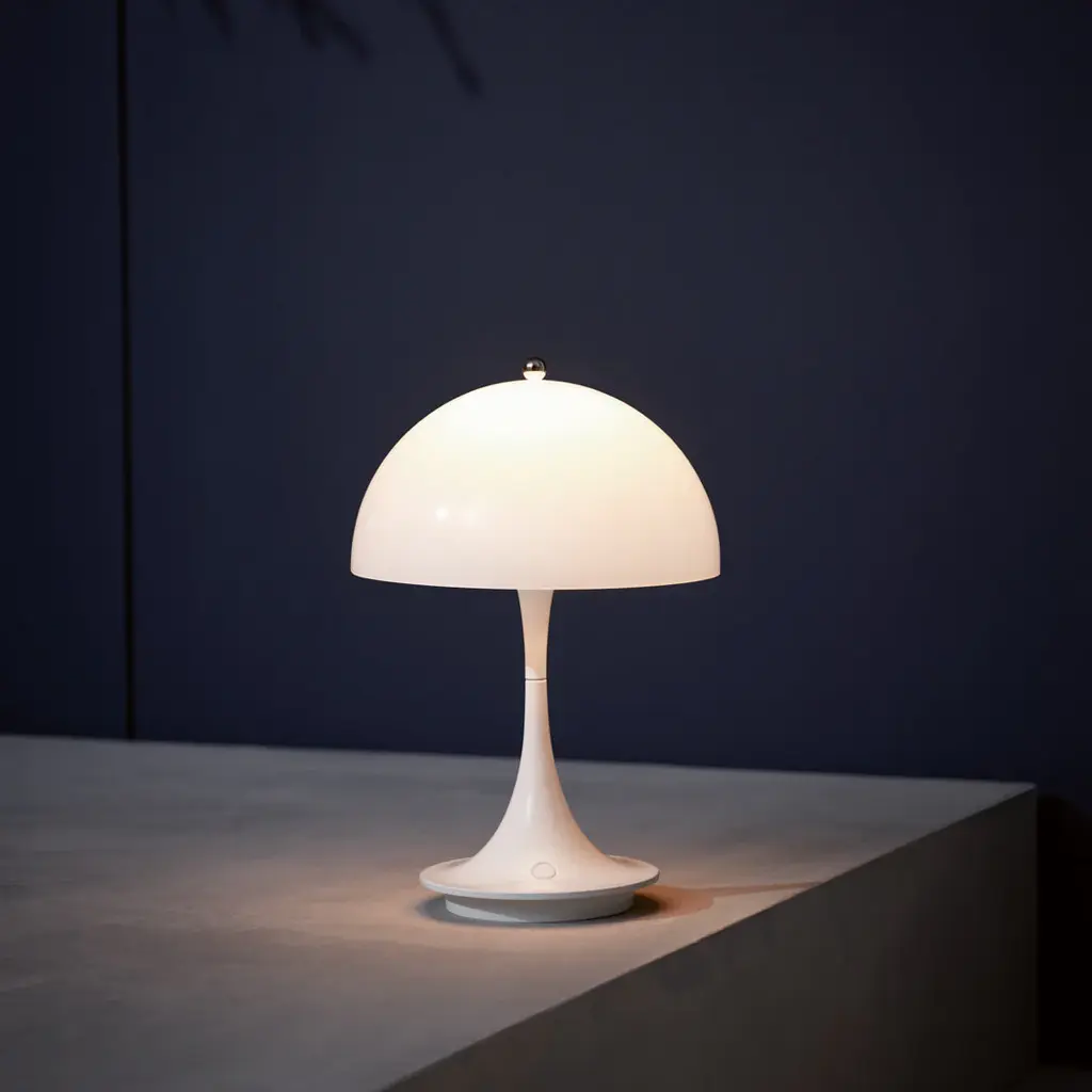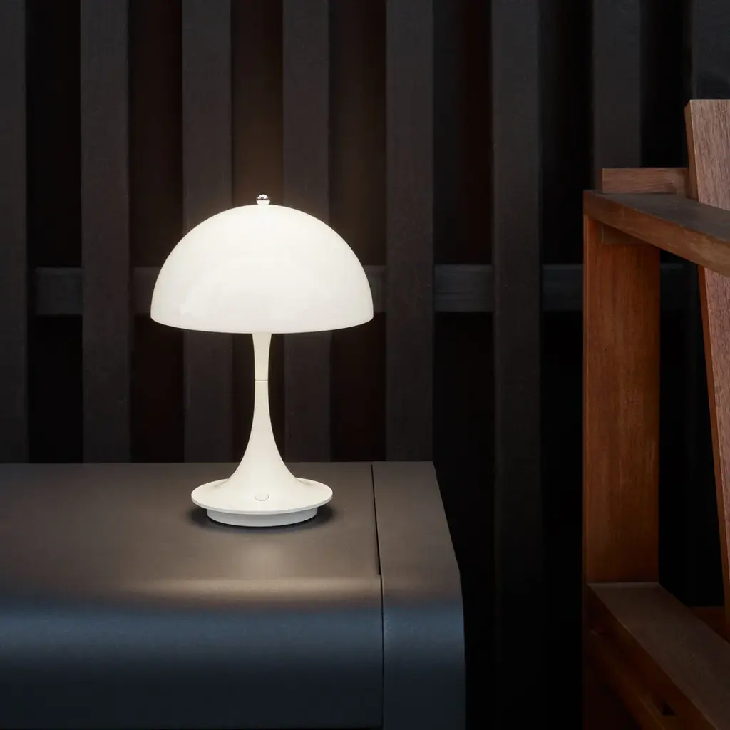The fixture lights up any space harmoniously without glare. The portable table lamp is available in opal, and the transparency of the shade and the reflection of the downward light on the inner side of the shade provides a gentle light and subtle ambience.