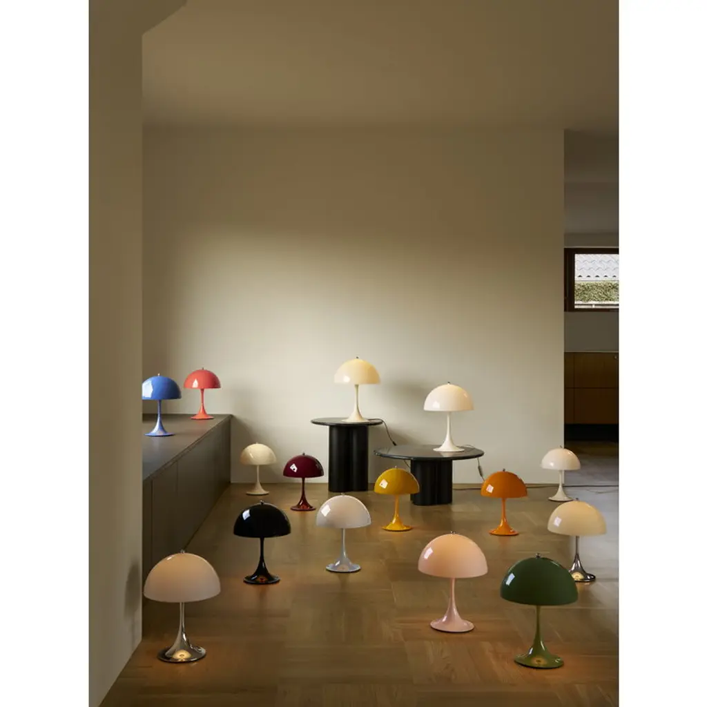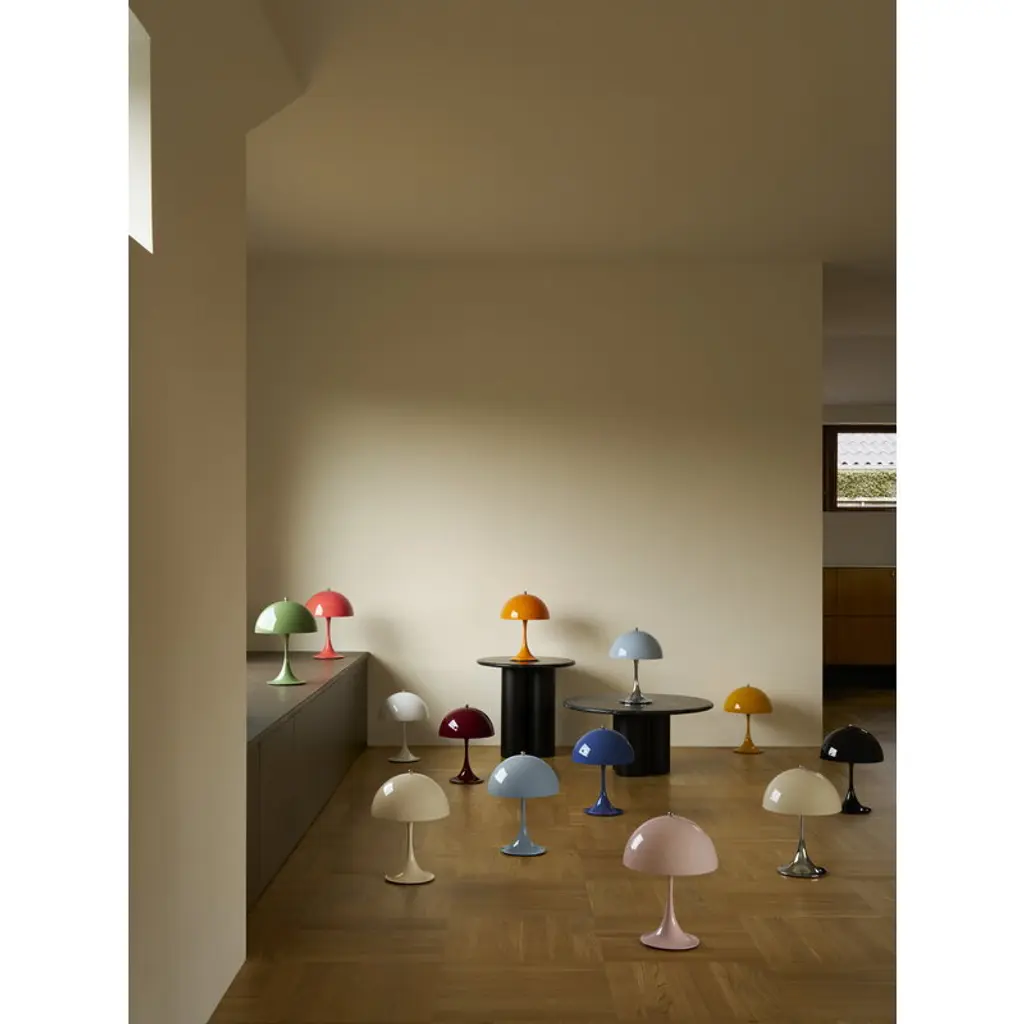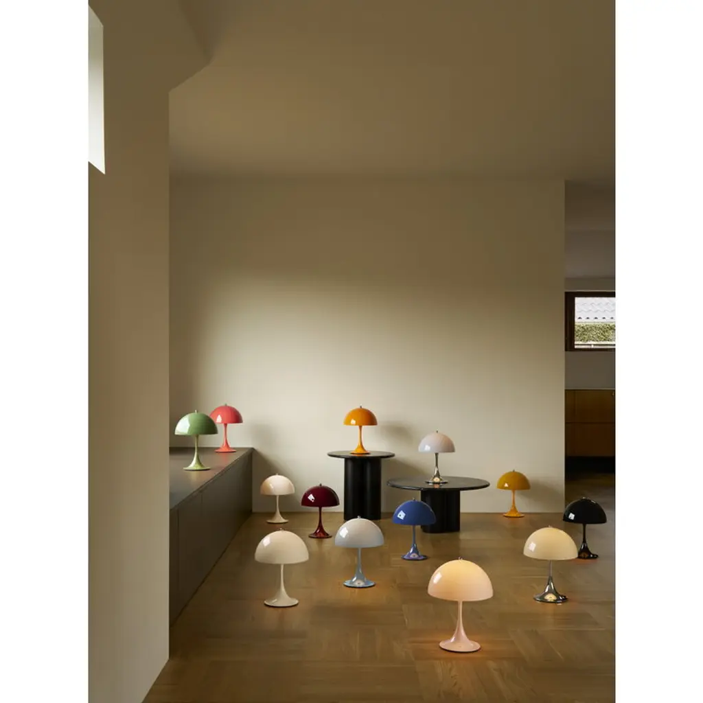 Louis Poulsen's Panthella 250 Portable table lamp is a smaller and cordless version of one of the most popular products designed by Verner Panton. The lamp is rechargeable and dimmable – it lights up your balcony or patio and is easy to grab along with you when you turn in for the night. The lamp runs on a rechargeable battery that can be replaced if needed, and its power switch is a small knob located at the top of the shade. When creating the original Panthella, Panton aimed to create a lamp in which the base and the shade would both act as reflectors. The light source is hidden under the hemispheric acrylic shade, while the trumpet-shaped base gives the lamp a distinctive, balanced silhouette and also contributes to the distribution of light. Originally released in 1971, Panthella is today still considered a classic of Danish design and is available in a range of sizes and shades.