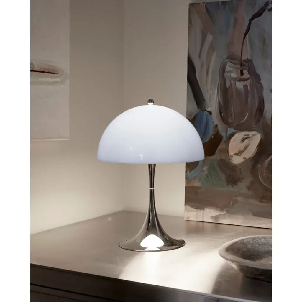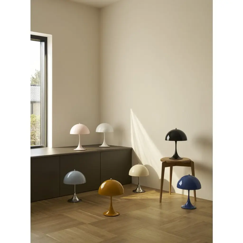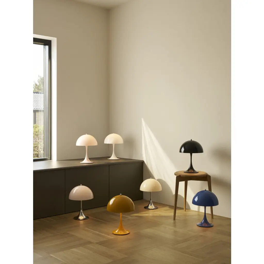 Louis Poulsen's Panthella 250 Portable table lamp is a smaller and cordless version of one of the most popular products designed by Verner Panton. The lamp is rechargeable and dimmable – it lights up your balcony or patio and is easy to grab along with you when you turn in for the night. The lamp runs on a rechargeable battery that can be replaced if needed, and its power switch is a small knob located at the top of the shade. When creating the original Panthella, Panton aimed to create a lamp in which the base and the shade would both act as reflectors. The light source is hidden under the hemispheric acrylic shade, while the trumpet-shaped base gives the lamp a distinctive, balanced silhouette and also contributes to the distribution of light. Originally released in 1971, Panthella is today still considered a classic of Danish design and is available in a range of sizes and shades.