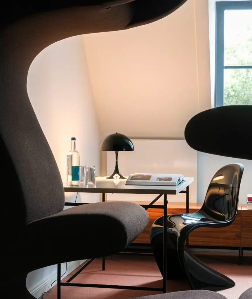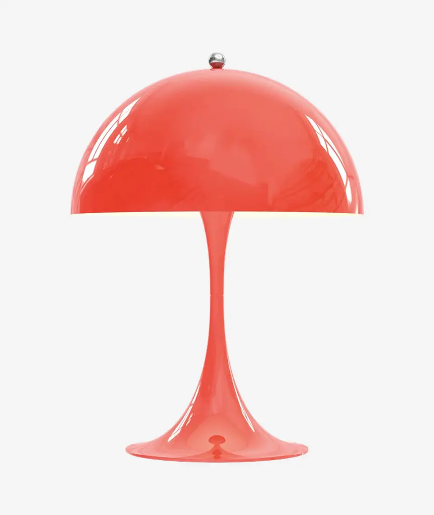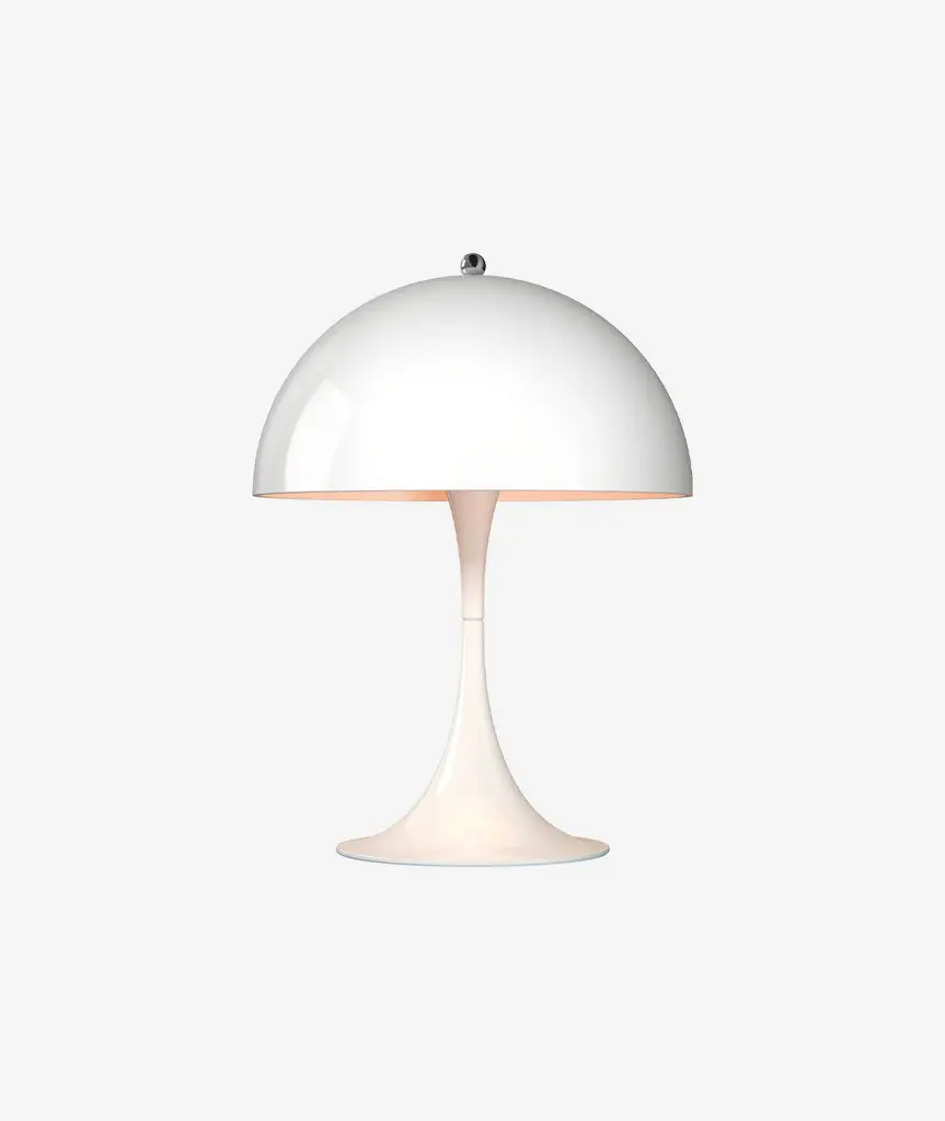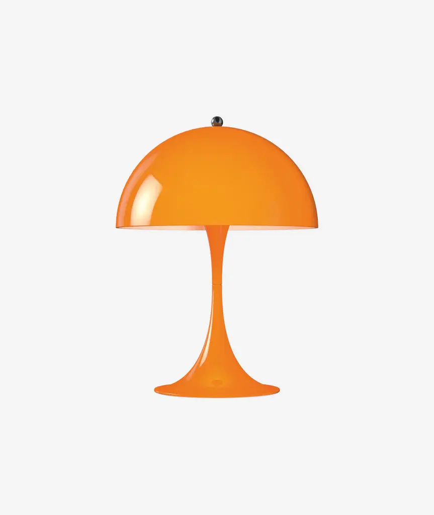 This fixture emits a soft, comfortable, glare-free, light. The metal-shade versions direct the light directly downward, creating a pleasant illumination due to the inner white-painted shade and the reflection from the trumpet-shaped stem. The opal acrylic produces a diffused, comfortable light due to the translucent shade, the downward reflection from the inner shade, and the reflection from the trumpet-shaped stem.  Electrical: System Wattage: 10W LED Wattage: 9W Delivered lumens: 428-589 Efficacy: 42 - 58 lm/W (LED) Certifications: cULus, Dry Location Protection class IP20 Controllability: Continuous dimming by touch switch on cord. Color Rendering: Ra≥90 Mounting: Cable type: White for brass, pale rose and white finishes; Black for other finishes. Cable length: 8'. LED-driver: Separate, plugs into power outlet. Light control: In-line switch. Auto shut-off timer: 4 hours/8 hours. Continuous dimming from 15% to 100%.Finish: White Opal Acrylic shade with white stand. Gray Opal Acrylic shade with high-luster chrome stand. High-Luster Vhrome shade and stand. Metalized Brass shade and stand. White, Black, or Orange shade and stand, Powder-coated. Materials: Shade: Injection-molded acrylic or deep-drawn steel. Base and housing: Cast aluminum. Diffuser: Injection-molded opal pmma.