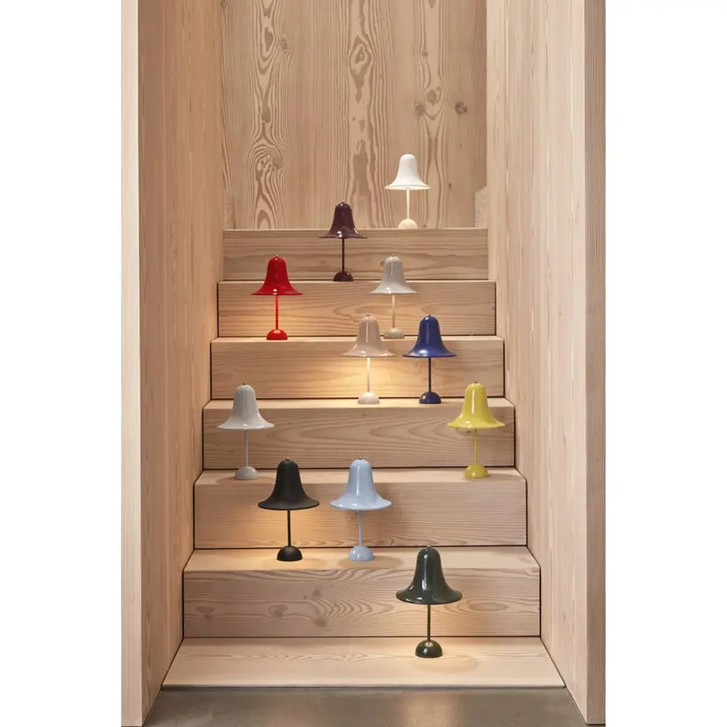 The rechargeable Pantop Portable table lamp brings light anywhere you need it. Lightweight, compact and cordless, Pantop Portable has a USB rechargeable battery that lasts for up to 7 hours on one charge. The three-step dimmer allows you to adjust the brightness according to the mood and need. Designed by Verner Panton in 1980 and today manufactured by Verpan, the Pantop table lamp is a fine example of Panton’s style in the late 20th century. Pantop features a flaring, bell-shaped lampshade that directs the light right underneath. The hemisphere-shaped base complements the geometric look of the luminaire. Pantop is both a joyful and elegant design icon that catches the eye either individually or in clusters.