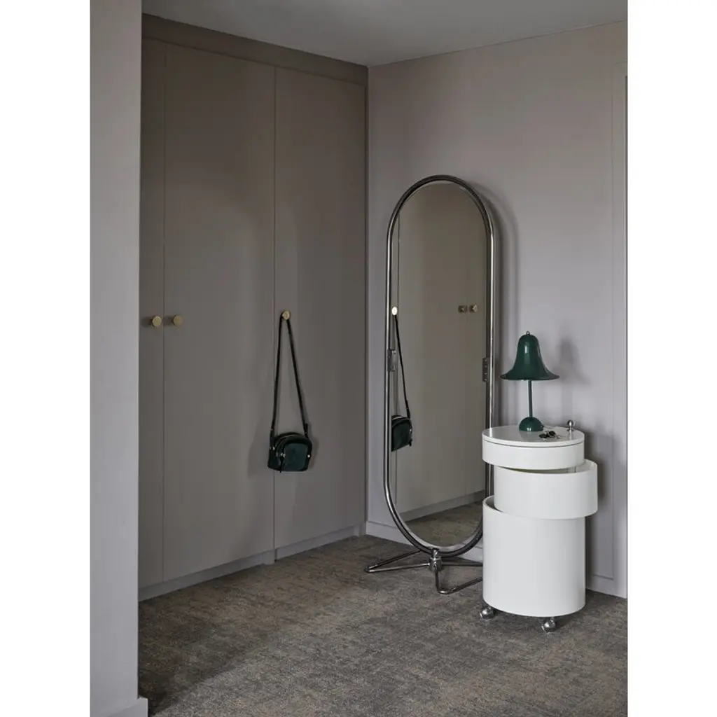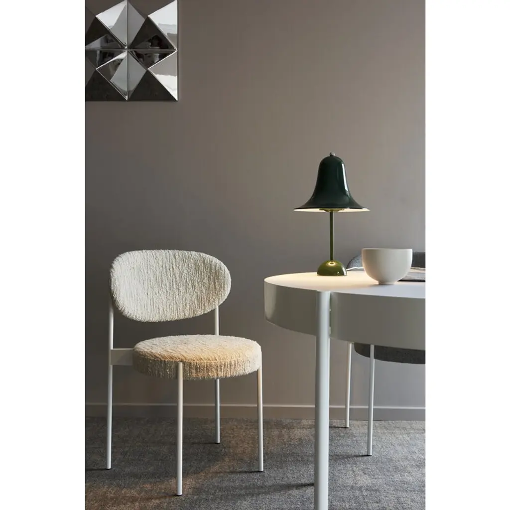 Designed by Verner Panton in 1980 and today manufactured by Verpan, the Pantop table lamp is a fine example of Panton’s style in the late 20th century. Pantop features a flaring, bell-shaped lampshade that directs the light right underneath. The hemisphere-shaped base complements the geometric look of the luminaire. Pantop is both a joyful and elegant design icon that catches the eye either individually or in clusters.