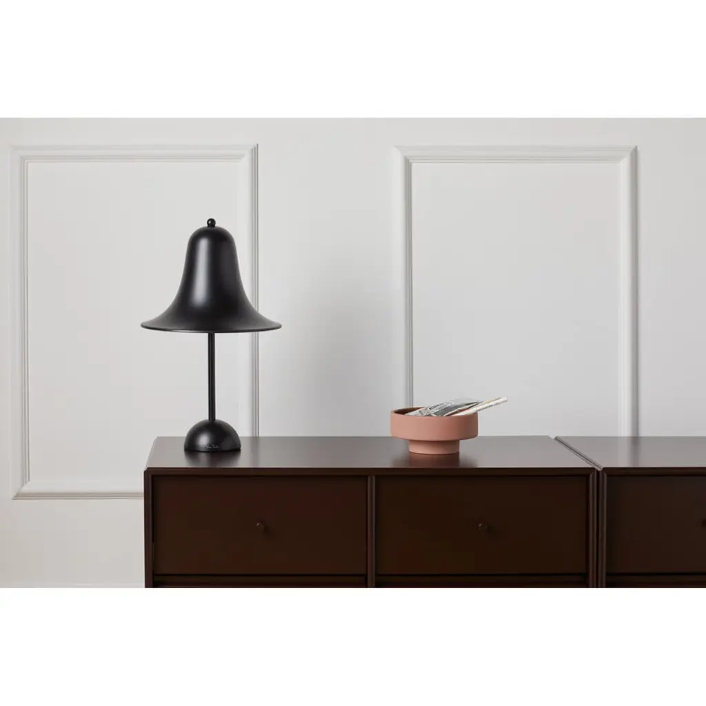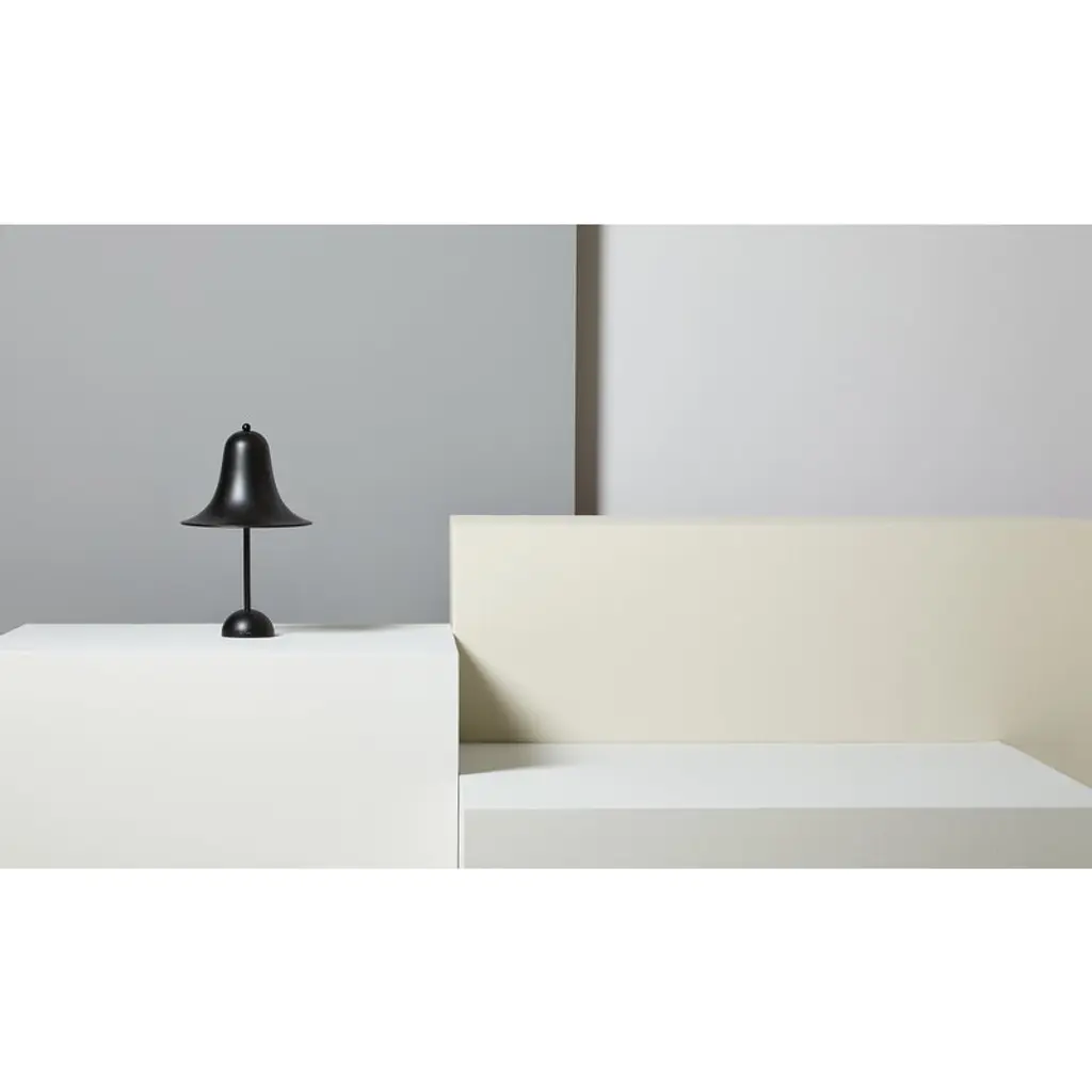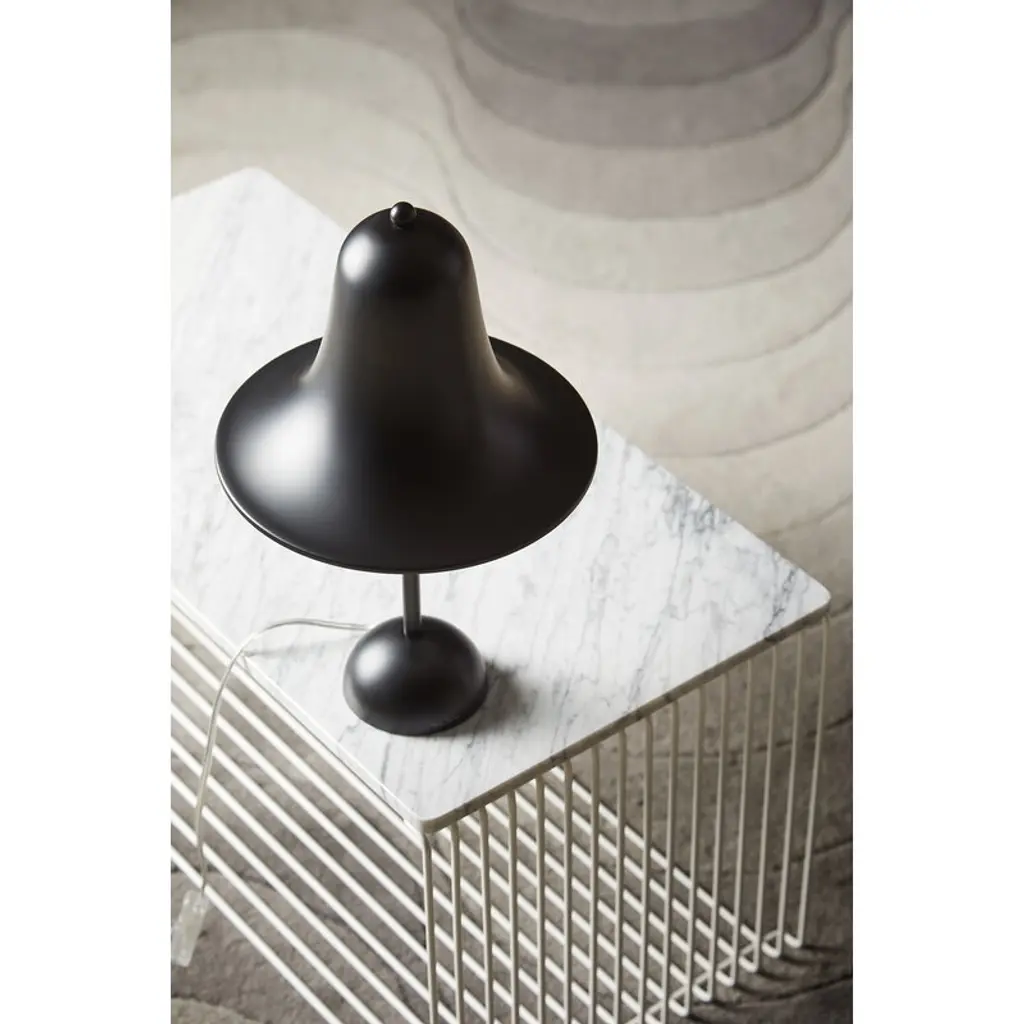 Designed by Verner Panton in 1980 and today manufactured by Verpan, the Pantop table lamp is a fine example of Panton’s style in the late 20th century. Pantop features a flaring, bell-shaped lampshade that directs the light right underneath. The hemisphere-shaped base complements the geometric look of the luminaire. Pantop is both a joyful and elegant design icon that catches the eye either individually or in clusters.