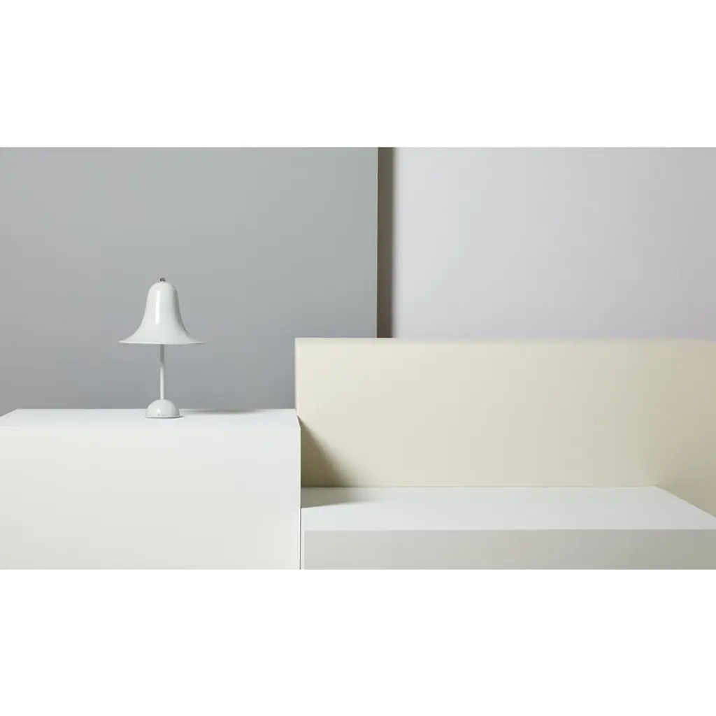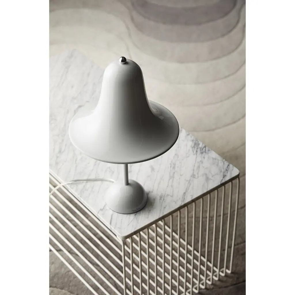 Designed by Verner Panton in 1980 and today manufactured by Verpan, the Pantop table lamp is a fine example of Panton’s style in the late 20th century. Pantop features a flaring, bell-shaped lampshade that directs the light right underneath. The hemisphere-shaped base complements the geometric look of the luminaire. Pantop is both a joyful and elegant design icon that catches the eye either individually or in clusters.