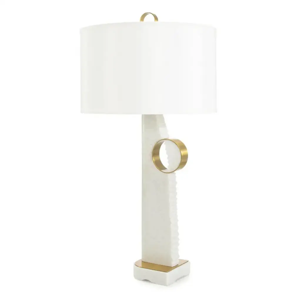 The Parallax Table Lamp is a sophisticated lighting solution with a full range dimmer that seamlessly blends opulent metalwork with rugged earthen materials. Crafted from shimmering stone, the piece features an abstract shape that showcases one straight edge paired with a curved, coarse edge. Midway down the coarse edge, a circular iron ornament finished in satin antique brass displaces the stone, resulting in a stylish use of negative space. The base, also crafted from shimmering stone, showcases a thin metal plate to match the neck ornament and rounded finial.