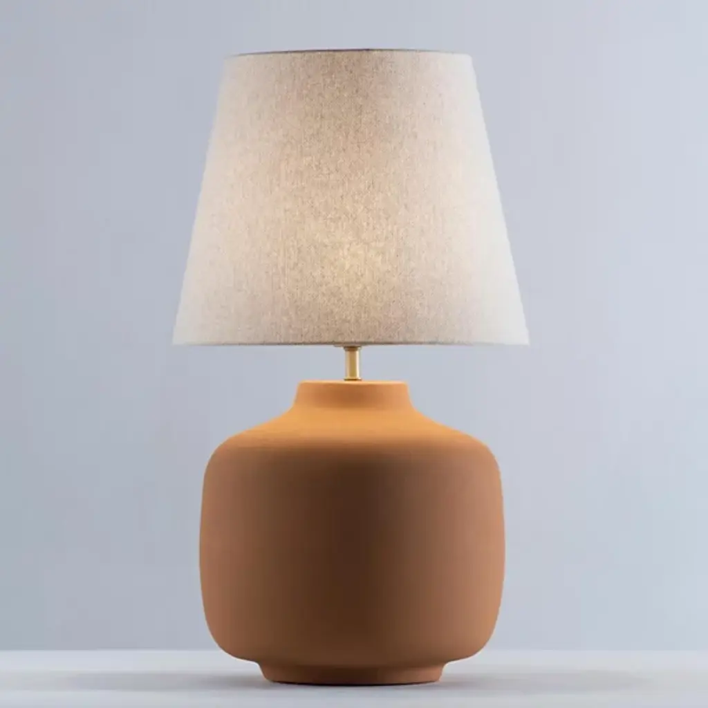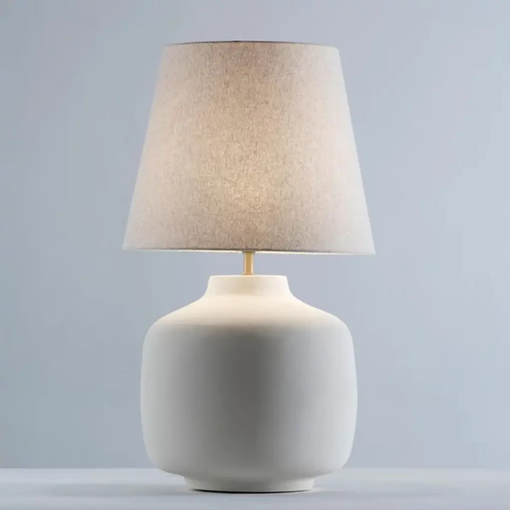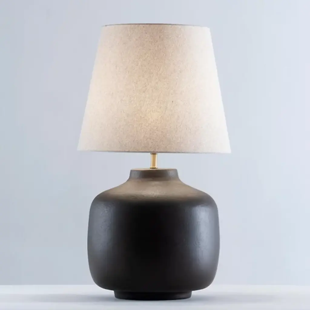 The Paraty Table Lamp from Geo Contemporary brings organic modernism to tabletop lighting. Its rounded base, indicative of a smooth river stone, provides a stable foundation and visual weight. The lamp's body transitions seamlessly into a slightly tapered neck crowned by a classic empire shade. The textured fabric shade softens the light, creating a cozy atmosphere perfect for bedside tables, living room end tables, or home office desks.
