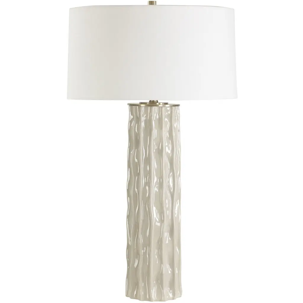 The Parilli Table Lamp Showcases An Organic Shaped Ceramic Base With Deep Vertical Channels And Wavy Ridges, Finished In A Taupe Gray Glaze And Paired With Brushed Nickel Details. The Round Hardback Drum Shade Is Covered In A Casual Off-white Linen Fabric With Natural Slubbing. Due To The Nature Of Fired Glazes On Ceramic Lamps, Finishes Will Vary Slightly.