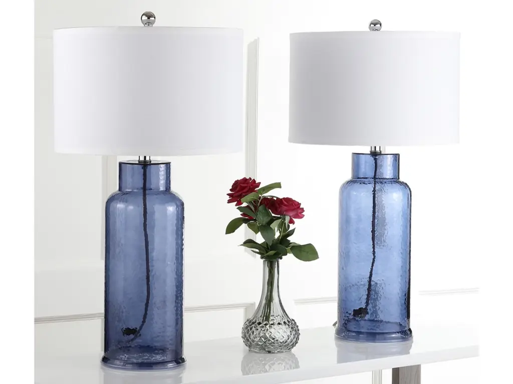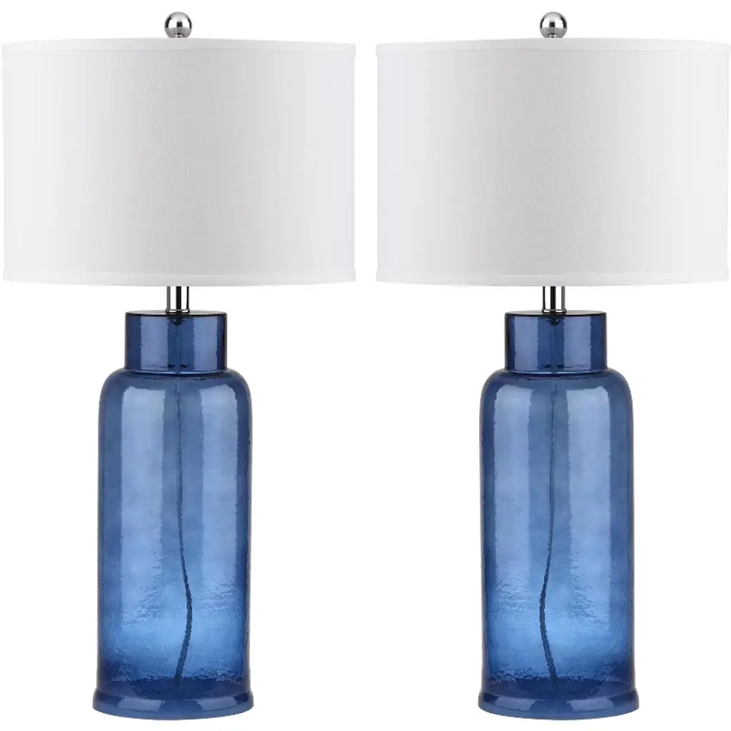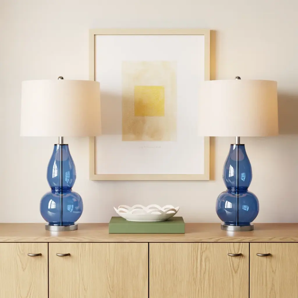 Brighten up your living space with this set of two glass table lamps, adding a touch of elegance to any room. These lamps feature a rotary socket switch and come with compact fluorescent (CFL) bulbs, providing 830 lumens of ambient light. The wheat-colored drum shades are made from 100% cotton, giving them a soft, cozy feel. Plus, the E26/medium (standard) bulb base ensures compatibility with a variety of bulb types. Just wipe clean with a dry cloth to keep them looking their best. Note: These lamps are designed for residential use and are not intended for commercial or non-residential settings.