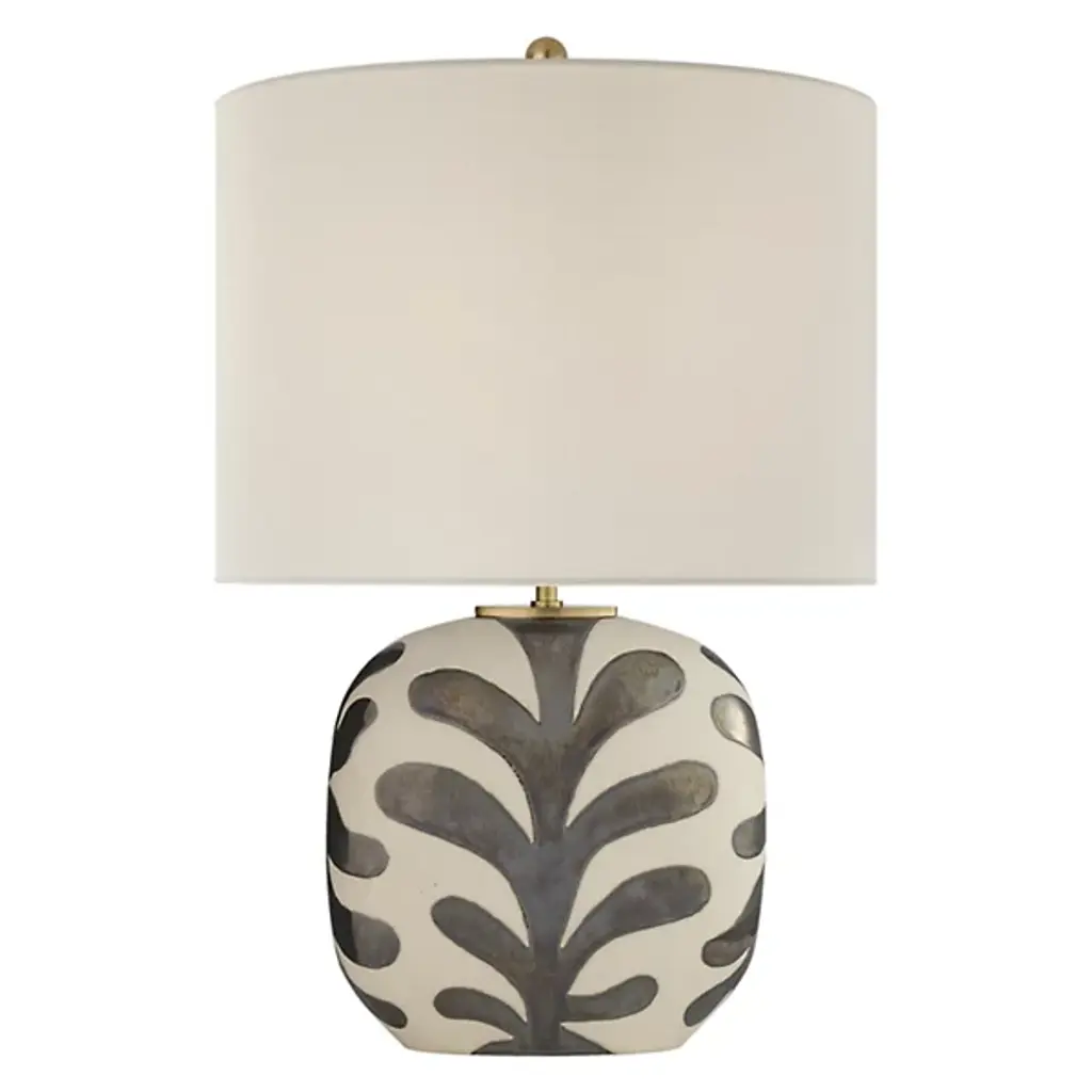 Bring an artistic look to your design plan with the Parkwood Table Lamp by Visual Comfort Signature, formerly known as Visual Comfort, A lovely shade of linen balances atop a metallic rod. Within this shade sits an incandescent bulb that gives your environment a pleasant glow. The eye-catching frond-like detailing that lines this piece gives the Parkwood Table Lamp a playful quality. Fine ceramic has been worked into a rounded form that complements your contemporary tabletop.