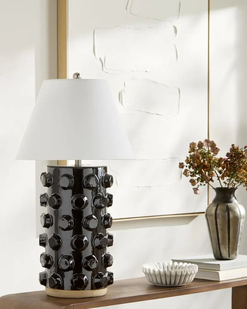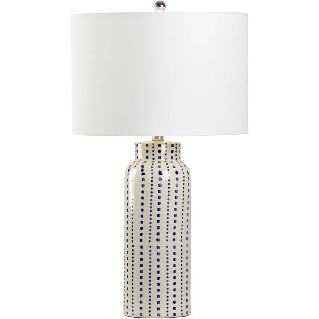 Transform your living space with the Pavan accent table lamp, a captivating blend of Art Deco Modern style and functional elegance. Standing tall at 34 inches, this lamp boasts a meticulously crafted ceramic body that brings a touch of sophistication to any room. Its linen shade, both inside and out, diffuses light with grace, while the iron finial adds a sleek finishing touch. Whether you're creating a cozy ambiance or making a bold statement, this lamp is as easy to maintain as it is stylish—simply wipe clean with a dry cloth to keep it looking pristine. Bring the timeless allure of the Pavan accent table lamp into your home and watch your decor come to life!