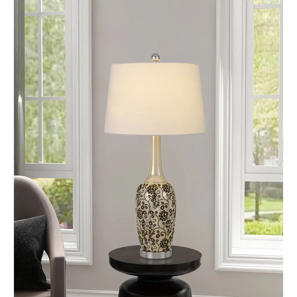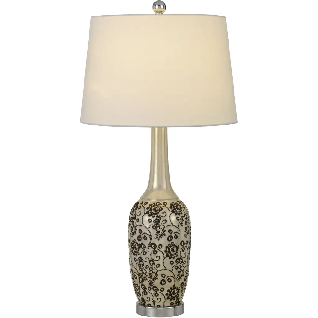 Update your décor with this long neck style glass table lamp. It features an iridescent pearl finish stamped with a black floral pattern design. The lamp ships complete with a hardback fabric shade and matching finial.