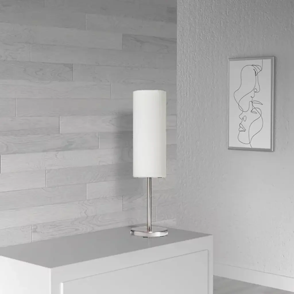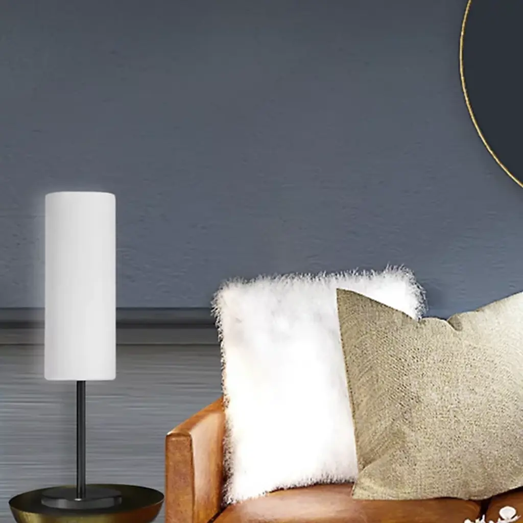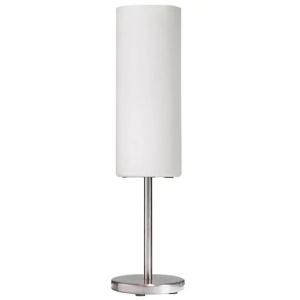 A petite table lamp designed to produce big light. The Paza Table Lamp by Dainolite features a cylindrical glass shade atop a similarly slender metal stem and base. In addition to having a generally clean profile, the shade evenly diffuses the light produced by the bulb housed within all around a bedroom, living room or workspace. With its small footprint, this table lamp can fit easily on side tables or desktops small or large.