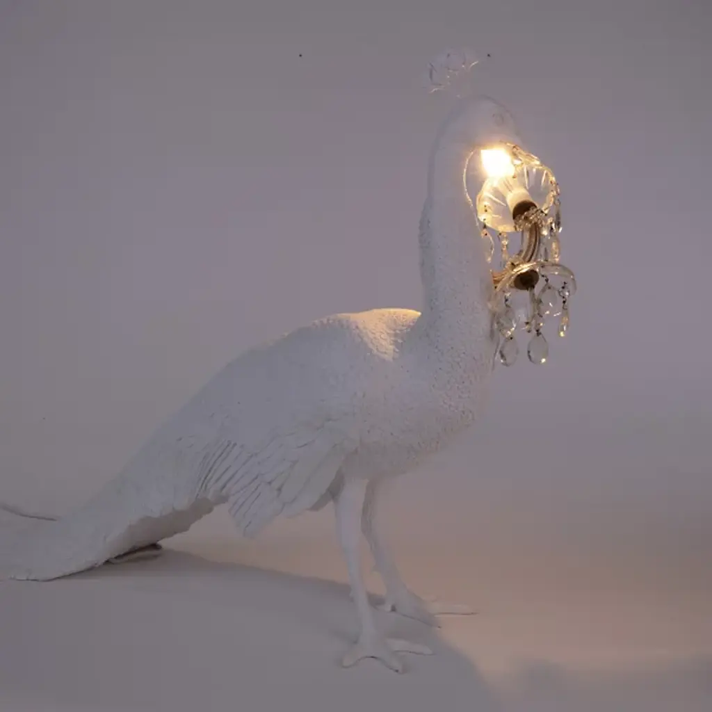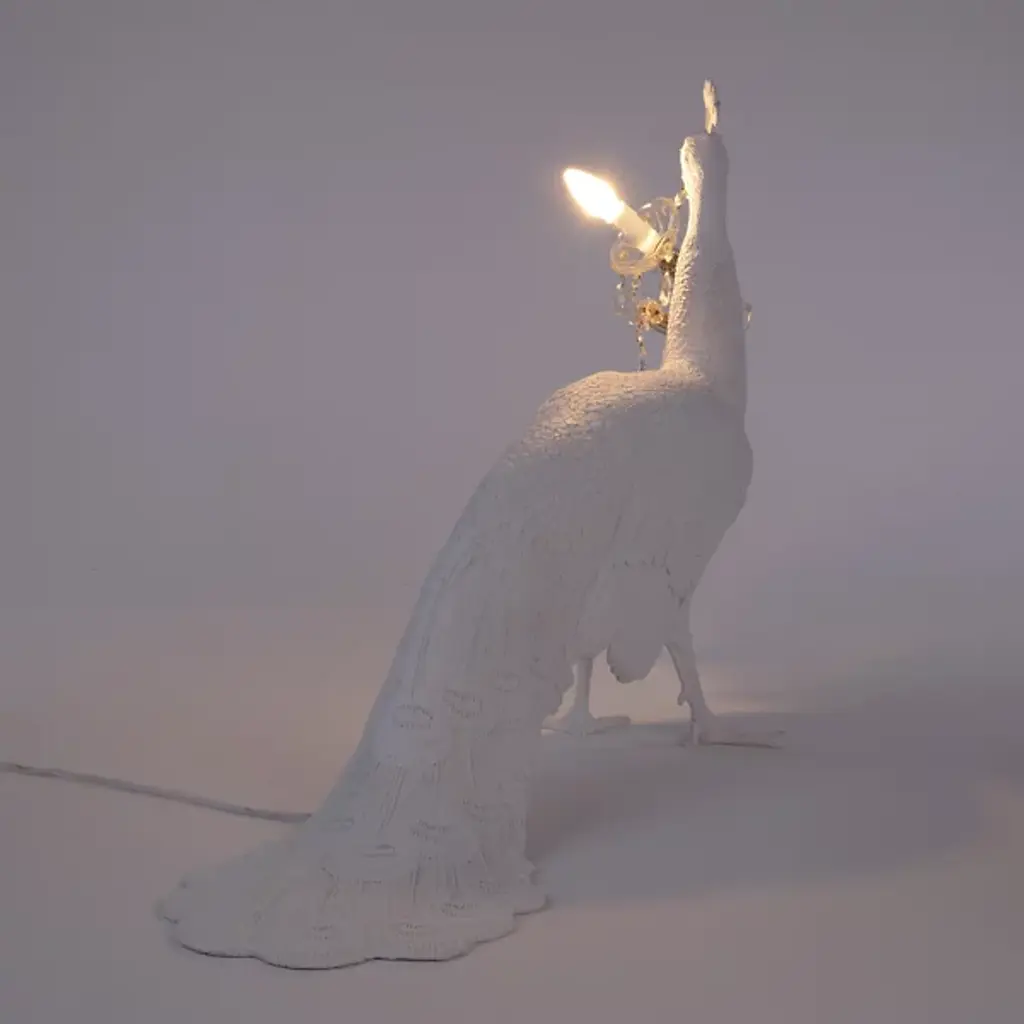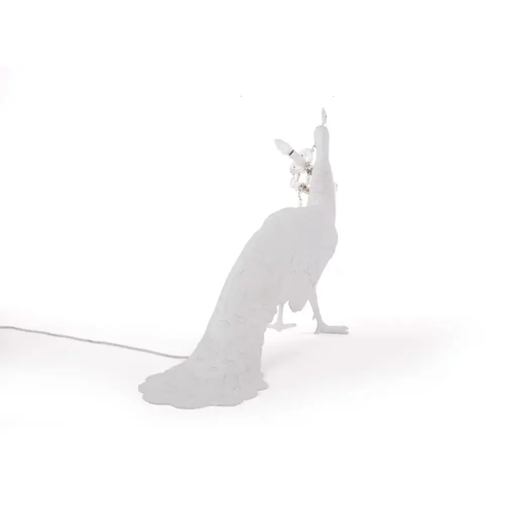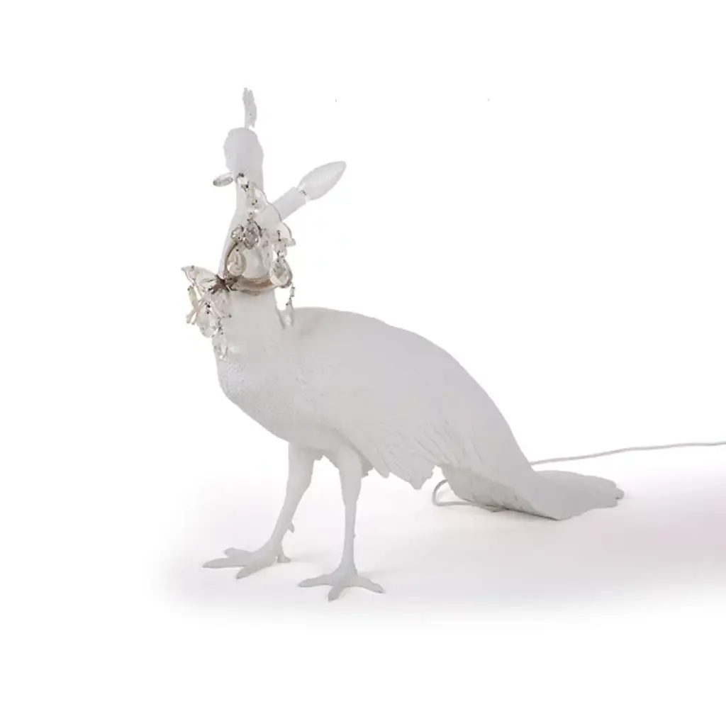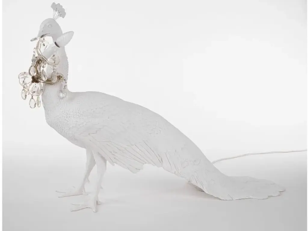 Elevate your space with the prominent and playful Peacock Table Lamp from Seletti. Designed by Marcantonio, this lamp exudes sophistication and charm with its posh peacock-inspired design. A peacock shape crafted from resin, the bird holds an intricate lamp in its beak, adding a touch of abstract luxury to any room. With its intricate detailing and chic aesthetic, the lamp transforms your space into a realm of whimsy and elegance, becoming the focal point of your decor with its unique and eye-catching design in a way only a peacock can.