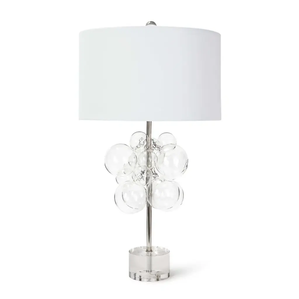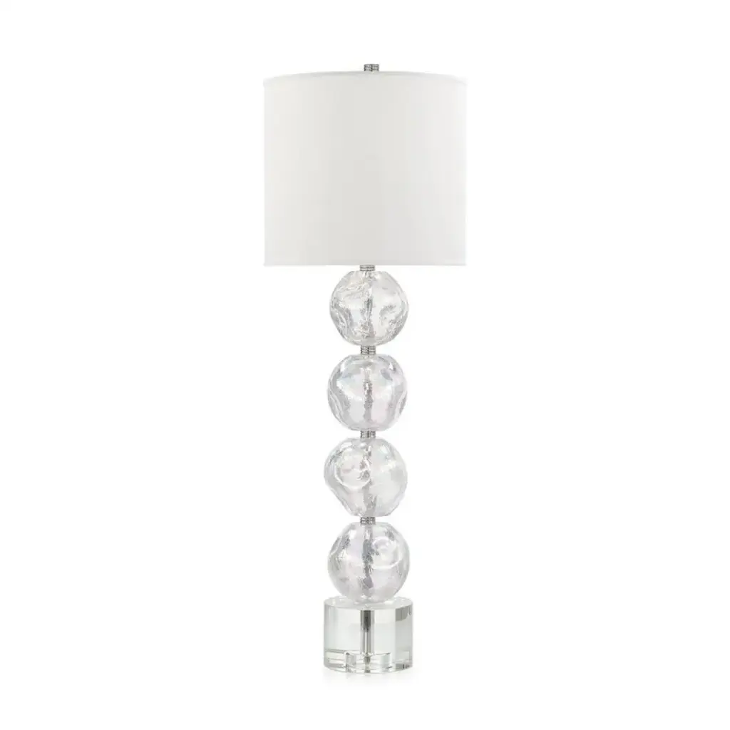 The Pearlescent Glass Table Lamp showcases seductive silhouette and instills an interior space with an aura of elegance. Crafted from clear glass with a colored glaze, the piece displays a stack of three curvaceous beads with a subtle crackle texture. The piece sits atop a rounded base of clear crystal and features hardware in a Nickel finish.