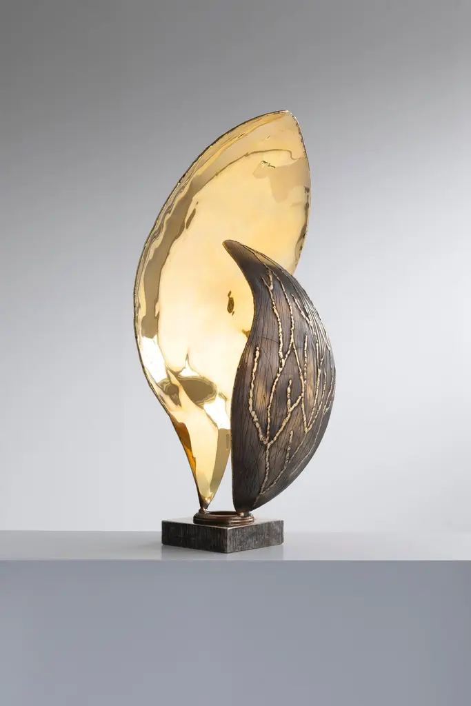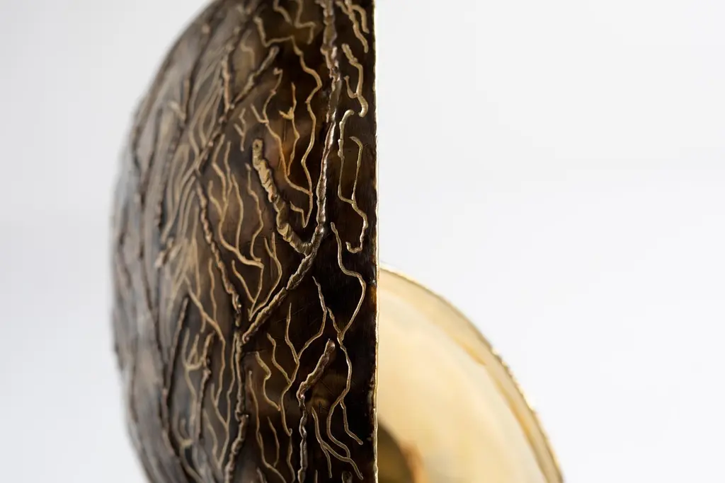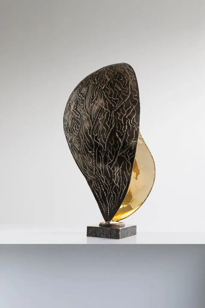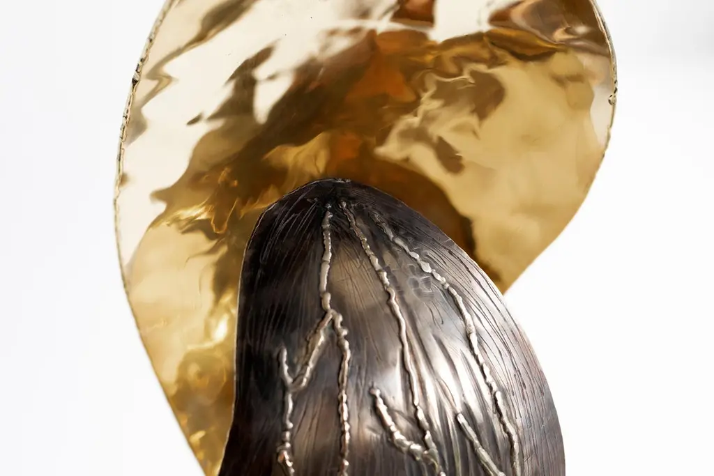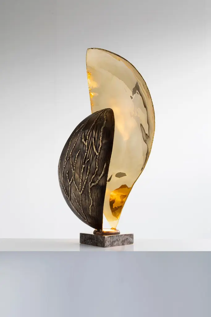 Peitil lamp by Samuel CostantiniEntirely handmade by the artistEdition 9 + 1 APDimensions: diameter 17 x height 45 cmMaterials: hand worked copper sheetTwo brass petals resting on a bronze base that protect and reflect the light. This creation comes from recycled materials, worked and beaten byhand. Entirely handmade.Samuel ConstantiniThe ability to create objects lies in the tradition in our hands. In ancient times, they were our only means of realizing our thoughts. Artisan is the one with this ability to breathe life into the raw material. Since Samuel Constantin was a young boy has tried to create the objects of his imagination. He has always believed when you make an object you have created yourself it is possible to bequeath something to that object and that my thoughts can be passed on via my hands.Metal is one of those materials which more than others allows you to give shape to ideas.Connection with the elements is basic when it comes to my objects being born. The principle element is earth, from which metal originates. The natural world around us is a source of inspiration for new techniques and new objects to be shaped. The earth has, over the centuries, already sculptured the most beautiful works of art. The second element is fire which governs metal. Over time he has come to understand that fire is never my servant. You can think that you dominate it, but in reality you never have full control over it. So fire contributes to the creation of objects as if it were a co-artist.The concept of the elements, the link with the territory, the precious metals often obtained from recycled materials, techniques from the past and the search for new ones give the creation all the subtleties it requires. This is the essence of Samuel Constantini's creations.After years of bringing to life the ideas of others, it is now time also to realize our own, giving hands and minds the freedom to experiment and create. There is no production line: every creation is made by hand and exclusively to order, and this enhances the individuality of the pieces, which are all numbered to make each one unique.