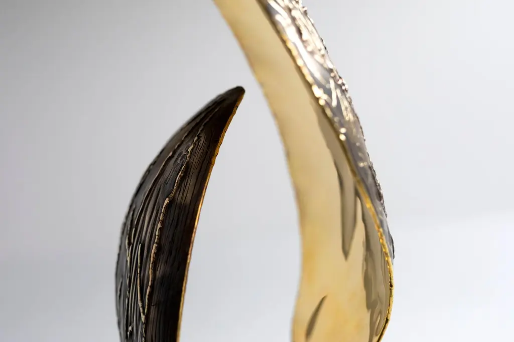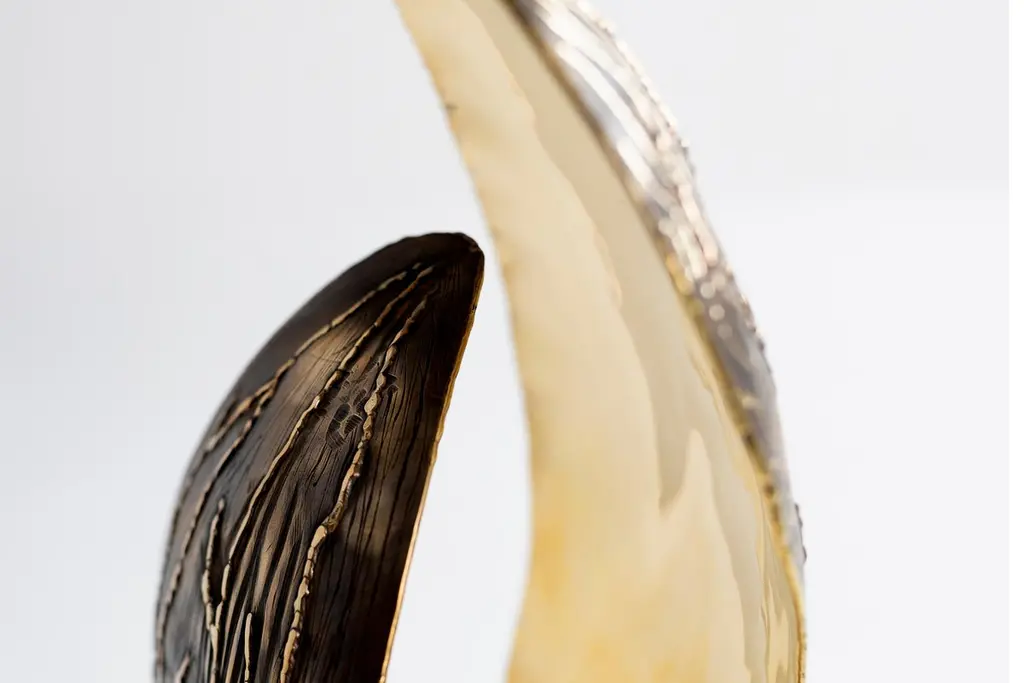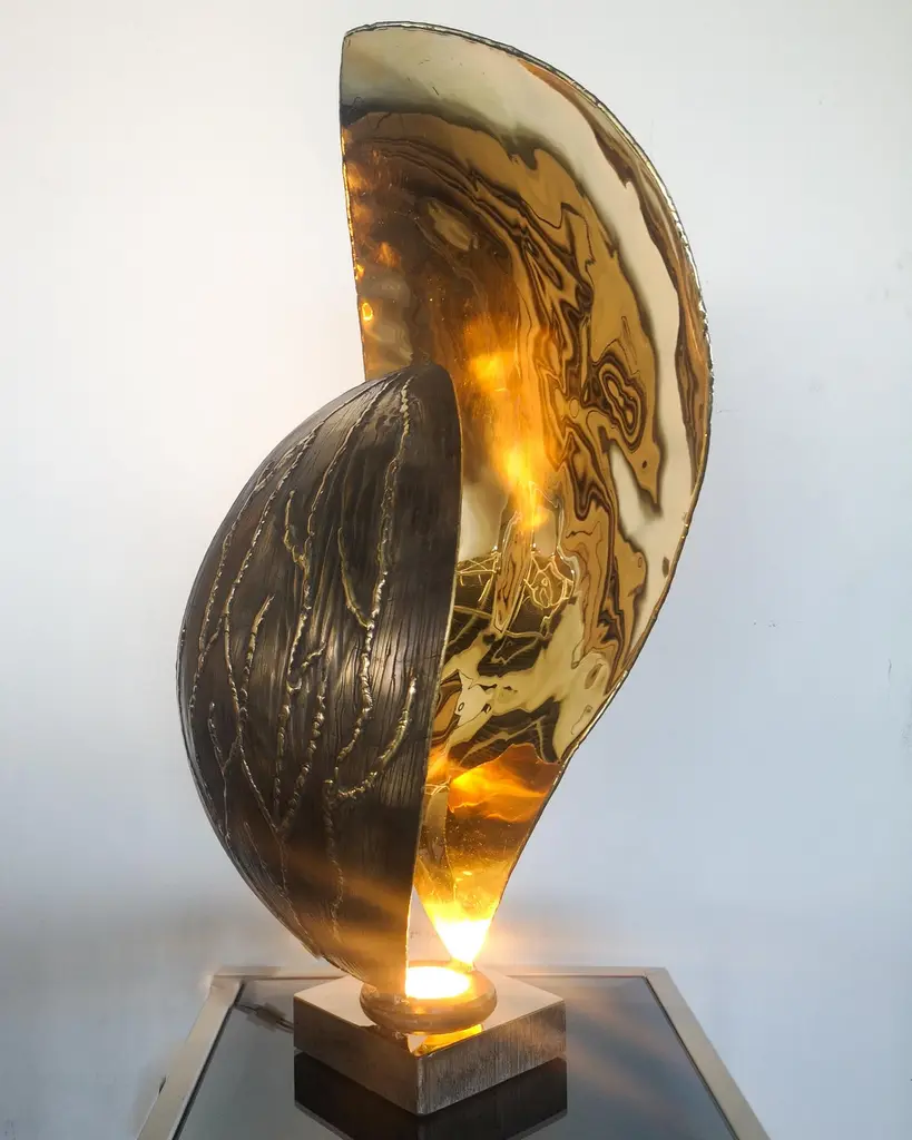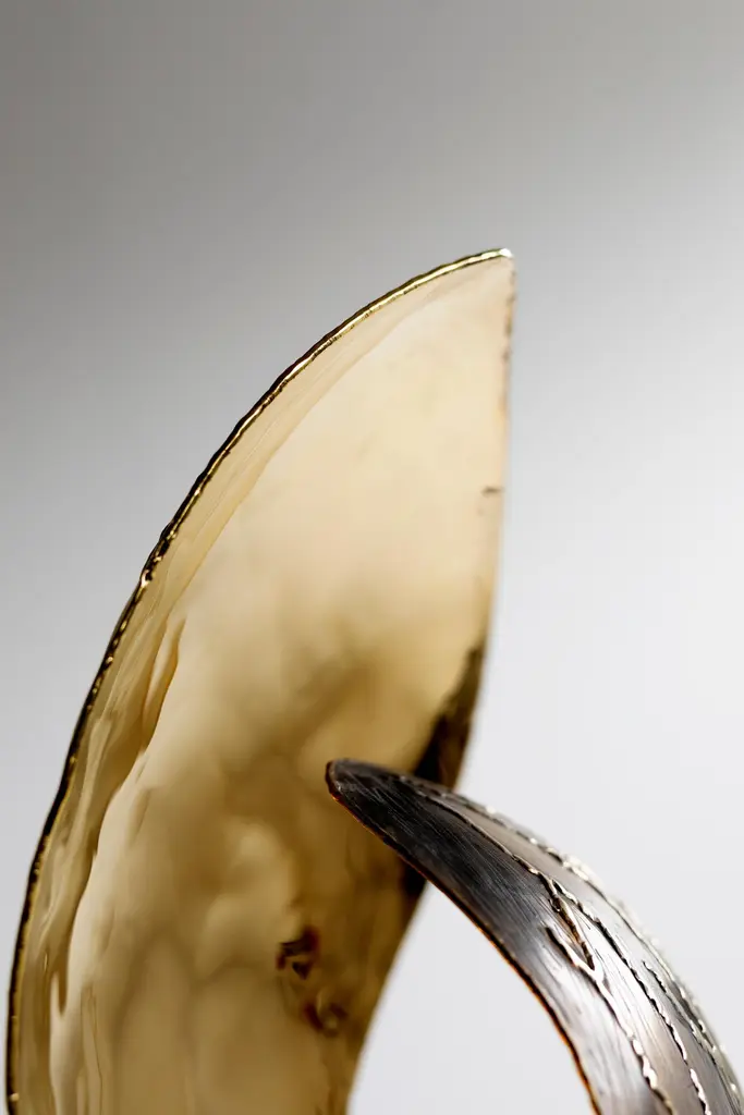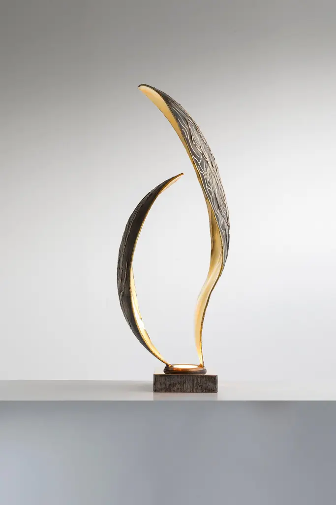 Peitil lamp by Samuel CostantiniEntirely handmade by the artistEdition 9 + 1 APDimensions: diameter 17 x height 45 cmMaterials: hand worked copper sheetTwo brass petals resting on a bronze base that protect and reflect the light. This creation comes from recycled materials, worked and beaten byhand. Entirely handmade.Samuel ConstantiniThe ability to create objects lies in the tradition in our hands. In ancient times, they were our only means of realizing our thoughts. Artisan is the one with this ability to breathe life into the raw material. Since Samuel Constantin was a young boy has tried to create the objects of his imagination. He has always believed when you make an object you have created yourself it is possible to bequeath something to that object and that my thoughts can be passed on via my hands.Metal is one of those materials which more than others allows you to give shape to ideas.Connection with the elements is basic when it comes to my objects being born. The principle element is earth, from which metal originates. The natural world around us is a source of inspiration for new techniques and new objects to be shaped. The earth has, over the centuries, already sculptured the most beautiful works of art. The second element is fire which governs metal. Over time he has come to understand that fire is never my servant. You can think that you dominate it, but in reality you never have full control over it. So fire contributes to the creation of objects as if it were a co-artist.The concept of the elements, the link with the territory, the precious metals often obtained from recycled materials, techniques from the past and the search for new ones give the creation all the subtleties it requires. This is the essence of Samuel Constantini's creations.After years of bringing to life the ideas of others, it is now time also to realize our own, giving hands and minds the freedom to experiment and create. There is no production line: every creation is made by hand and exclusively to order, and this enhances the individuality of the pieces, which are all numbered to make each one unique.