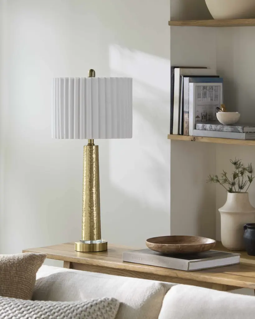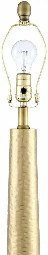 Collection: Penhalonga Colors: Metallic - Brass, White, Translucent Material: Body: Iron / Base: Iron / Shade (Outside): Cotton / Finial: Iron Styles: Traditional Made In: China Lighting Type: Accent Table Lighting Base: Iron Base Color: Metallic - Brass Shade Material: Cotton Shade Color: White, White Cord Length: 6' Switch Type: On/Off Number of Bulbs: 1 Socket Type: E-26 Bulb Wattage: 100W
