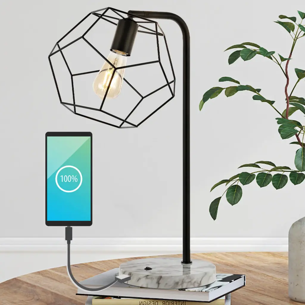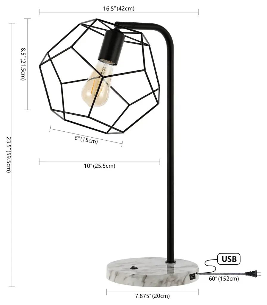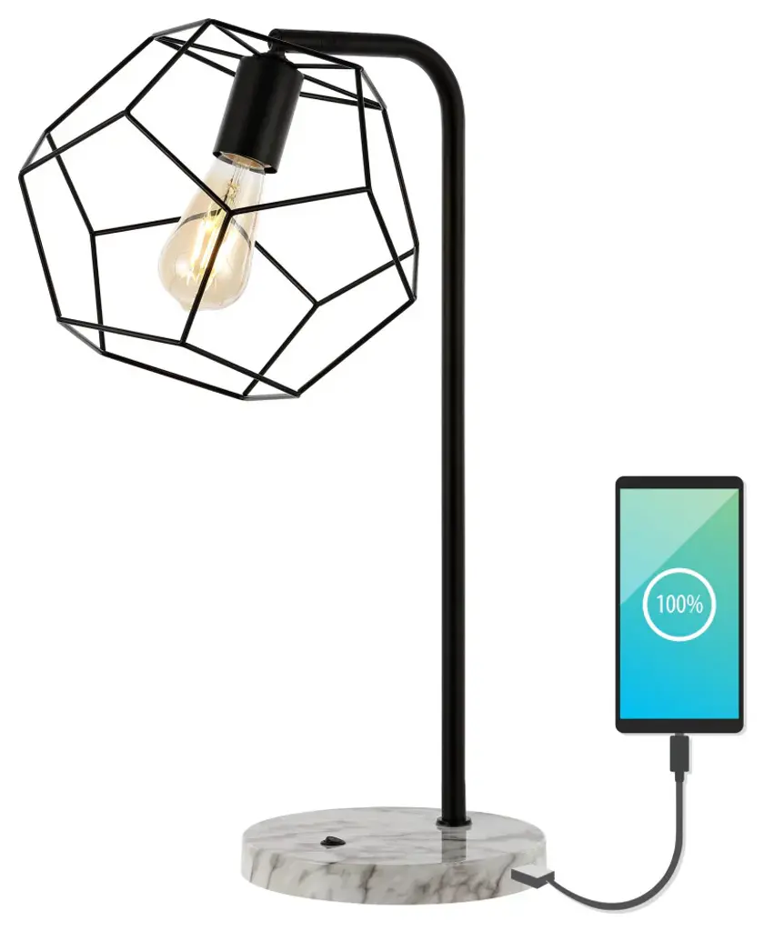 Industrial style meets minimalist design in our modern caged-bulb table lamp. The metal shade provides a sculptural frame for an Edison-style LED bulb. Cast moody shadows with the adjustable lamp head in a farmhouse living room, home office or bedroom.Features:• This caged-bulb lamp has a black metal finish and faux-stone marble base for low-key modern style• Quality touches include an pivotable lamp head, and a convenient USB charging port• Our minimalist accent lamp adds an industrial touch to your modern farmhouse, mid-century ranch, or Bohemian loft• Eco-friendly 4W LED bulb included• Takes 1 bulb and compatible with TYPE "A" 40W or CFL 13W or LED 9W• Color: Black• Body Material: Metal• Includes: One (1) lamp• Assembly RequiredDimensions:• Lamp: 23.5 inches high x 16.5 inches wide x 10 inches deepAbout us:You see a lamp.We see a decorative work of art.A perfectly curved shade casts a dramatic shadow on a floor. Compatible with LED lightbulbs: as easy on the environment as they are on the eyes. The JONATHAN Y Lighting collection considers every detail from impeccably sourced materials to designer styling. And our prices are so attractive, we''ve transformed a functional necessity into a fashion accessory.JONATHAN Y Lighting - a fashion revolution in home decor.