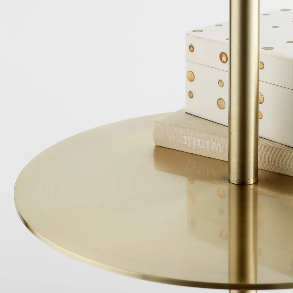 With the Peplum lamp, you get a two-for. This lovely luminary is a combination lamp with a small accent table surface surrounding the center frame, formed to resemble a skirt. The iron frame is coated in a stunning brass finish, paired with a crisp, white cotton drum shade. This lamp is overall transitional in its design, allowing it to work seamlessly in styles ranging from modern to traditional. Whether you incorporate into a residential living room, bedroom, or entryway space or commercial, hospitality, or office space, this lamp is the unique choice for you.