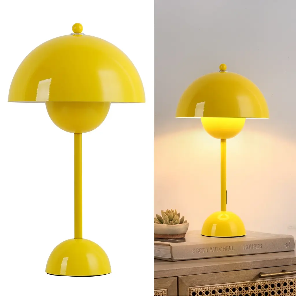 Collection: Peralillo Colors: Yellow, White Material: Body: Iron / Base: Iron / Shade (Outside): Metal Styles: Contemporary Made In: China Lighting Type: Accent Table Lighting Base: Iron Base Color: Yellow Shade Material: Metal Shade Color: White, Yellow Cord Length: 0' Switch Type: Dimmer Number of Bulbs: 1 Socket Type: E-26