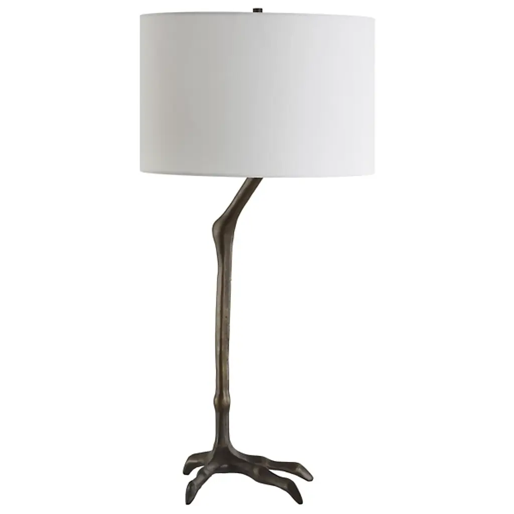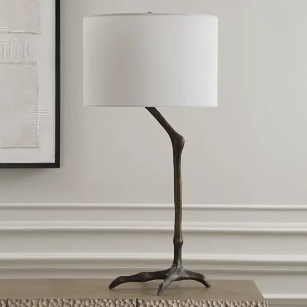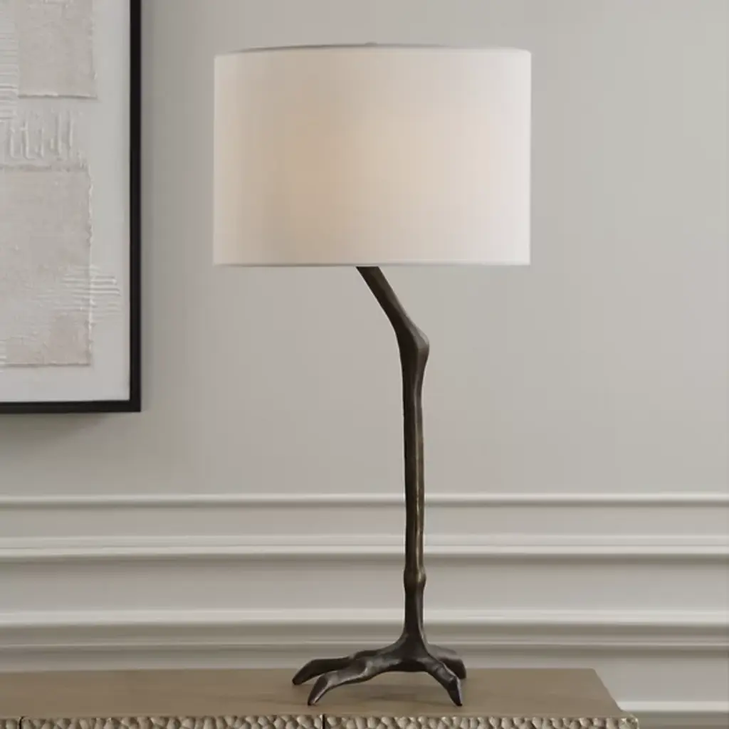 Sharp and unforgettably fun, the Perch Table Lamp from Uttermost brings a playful twist to Mid-Century Modern design. Designed by Osvaldo Mendoza, this lamp features a slender cast iron base, artfully shaped like a bird’s leg, with rustic texture creating a charming, nature-inspired look. A white linen drum shade completes the look, its cylinder shape contrasting with the slender structure and adding ample whimsy and appeal to any space, illuminating whatever perch it illuminates.