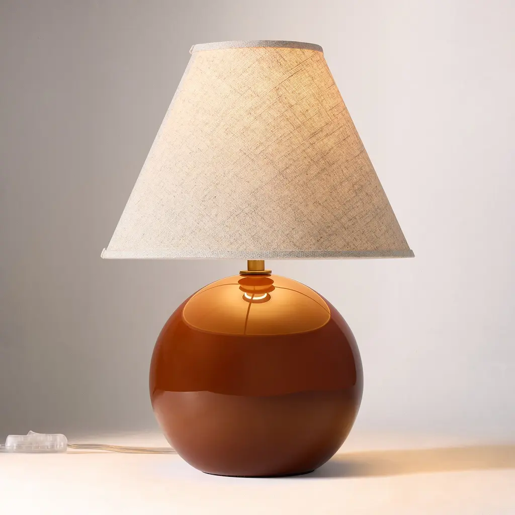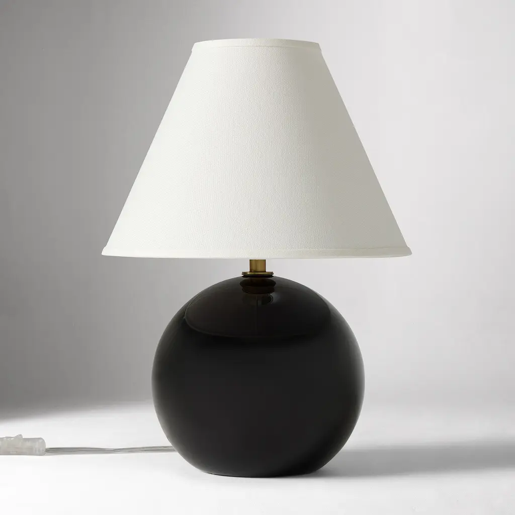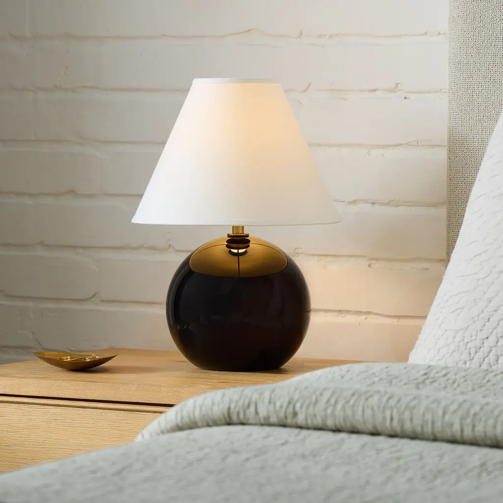 A sculptural ball-shaped base adds modern elegance to any space. The soft linen shade diffuses a warm, inviting glow. Compact yet striking, perfect for bedside tables or desks. Combines style and function for a timeless lighting solution.