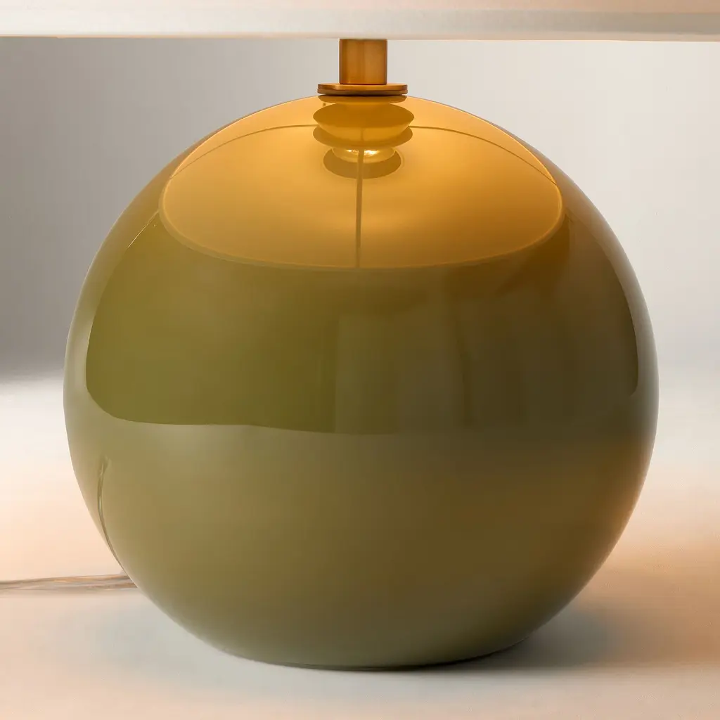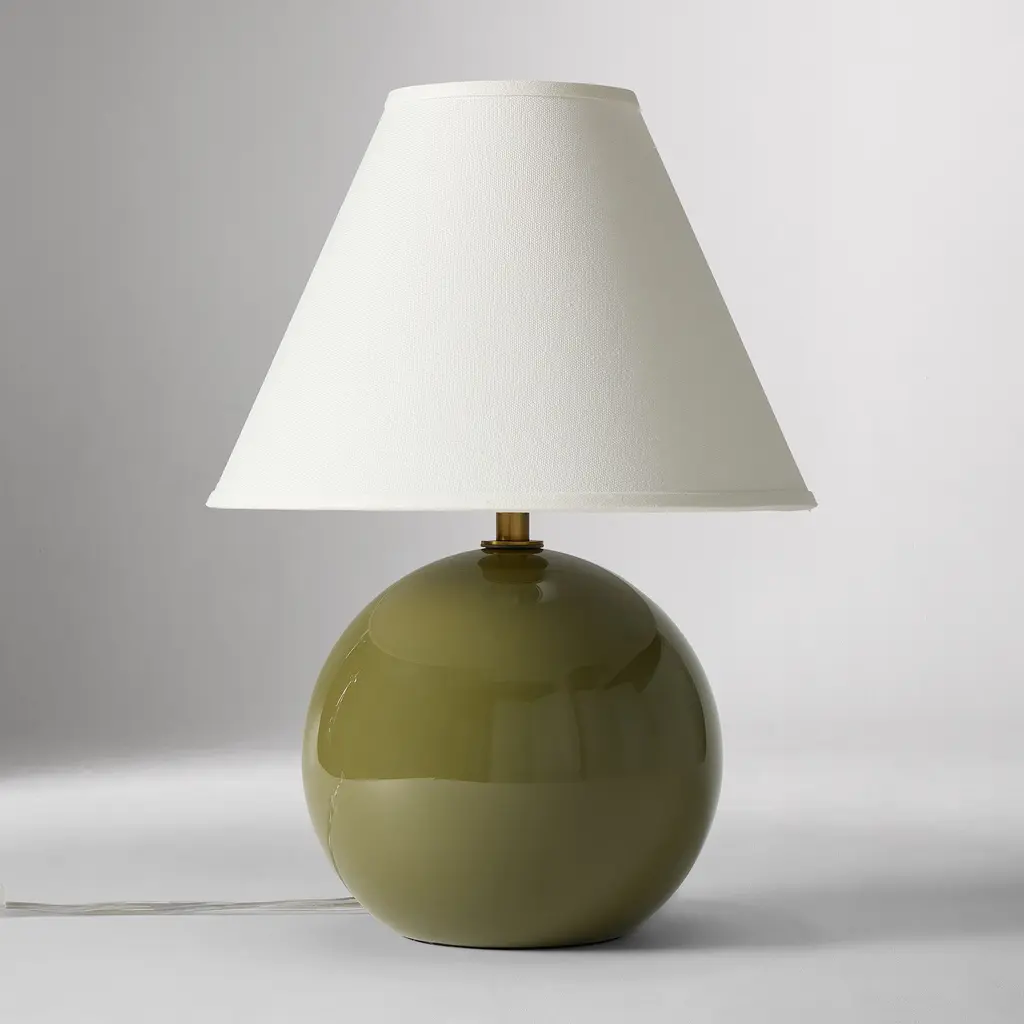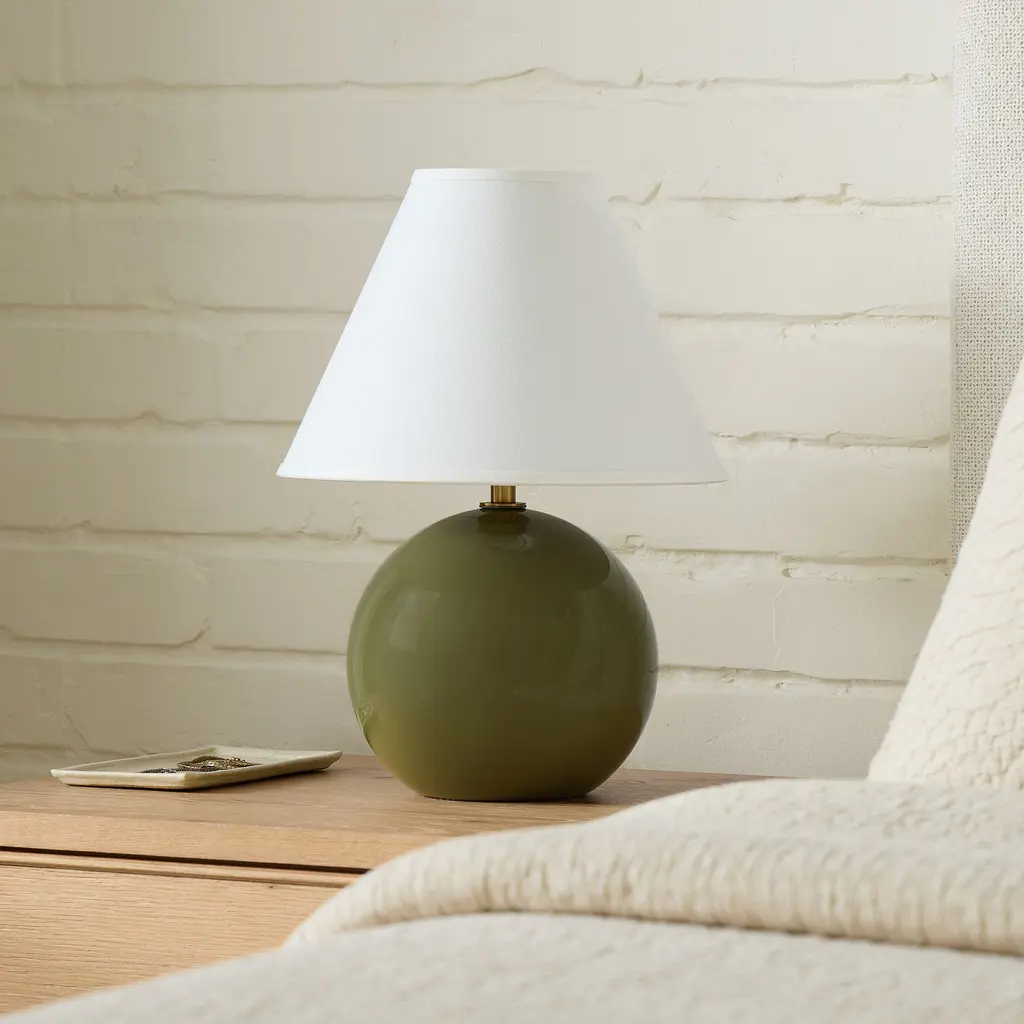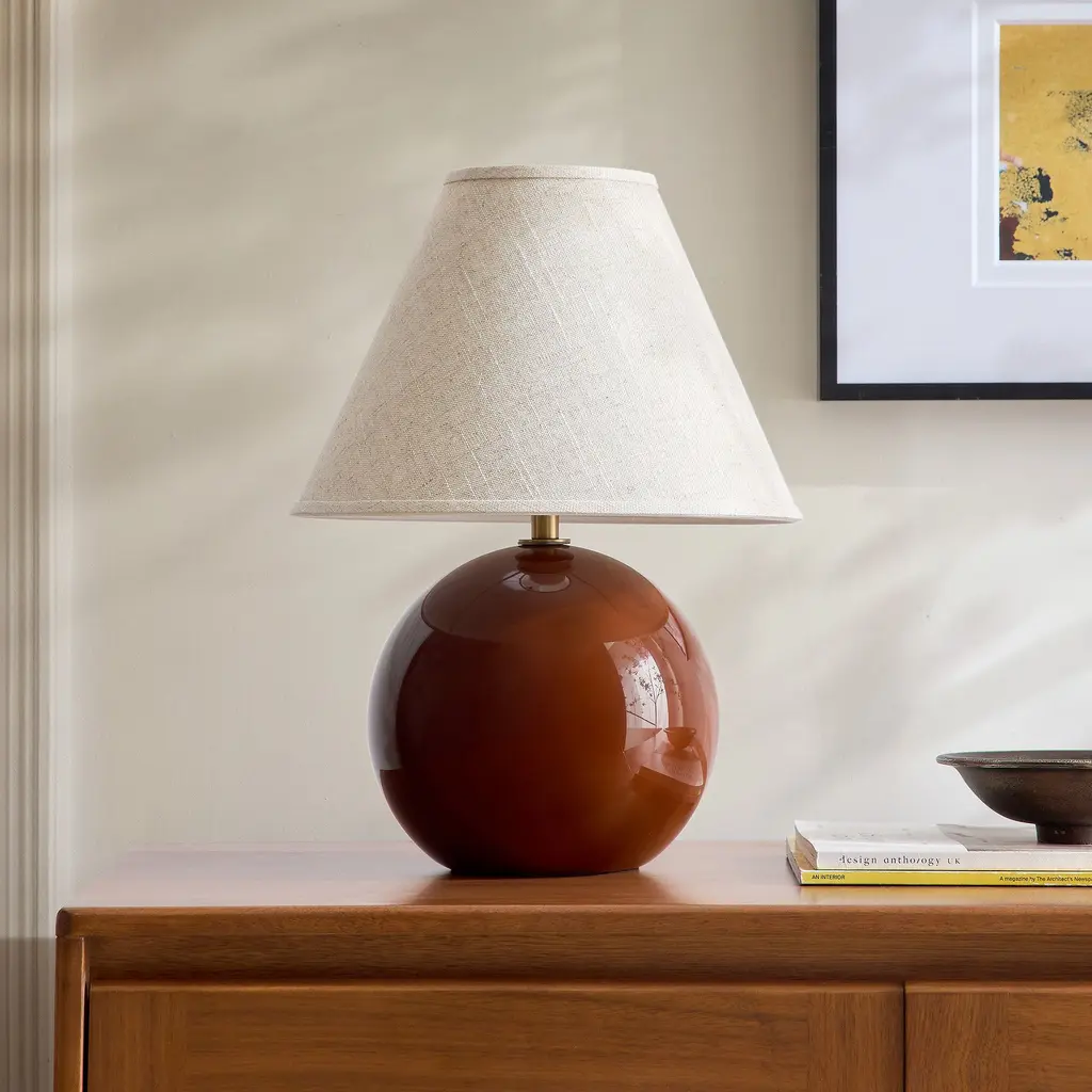 A sculptural ball-shaped base adds modern elegance to any space. The soft linen shade diffuses a warm, inviting glow. Compact yet striking, perfect for bedside tables or desks. Combines style and function for a timeless lighting solution.