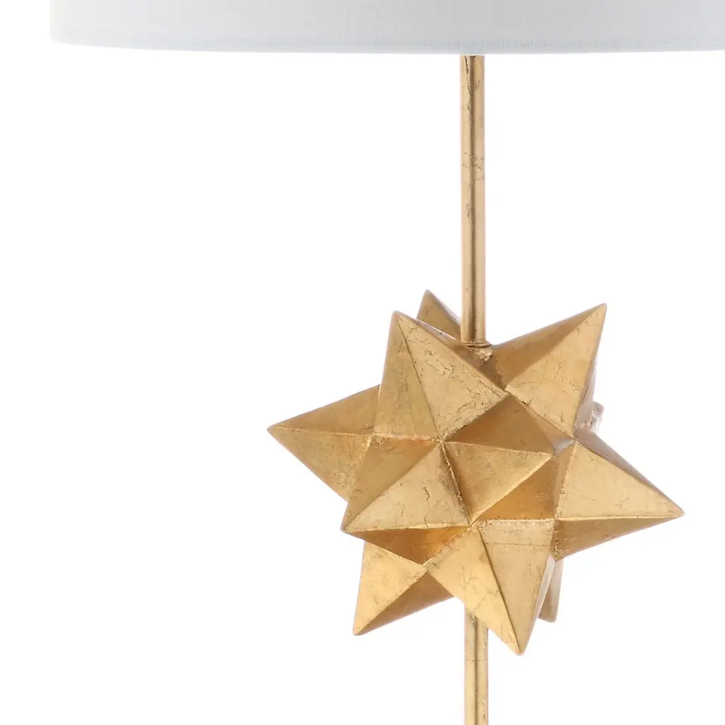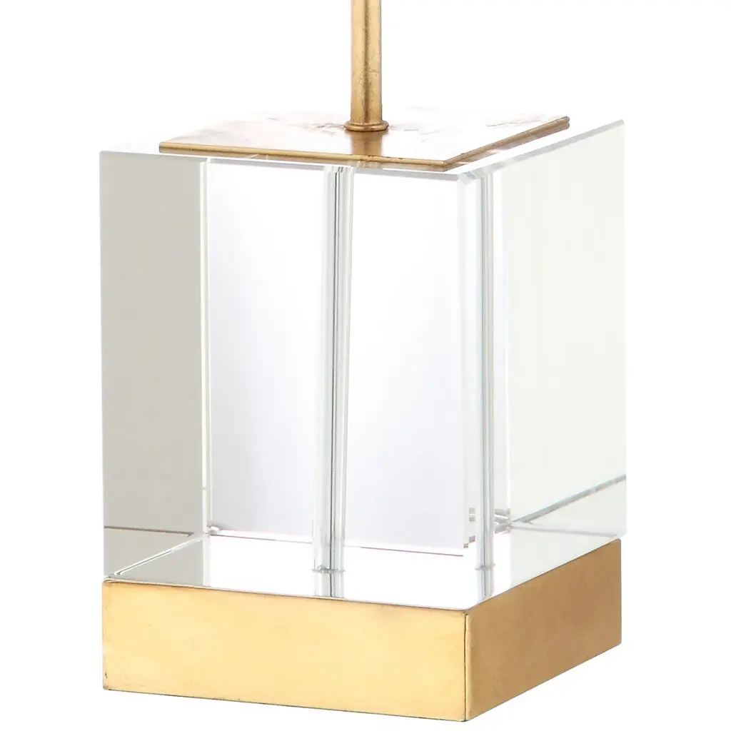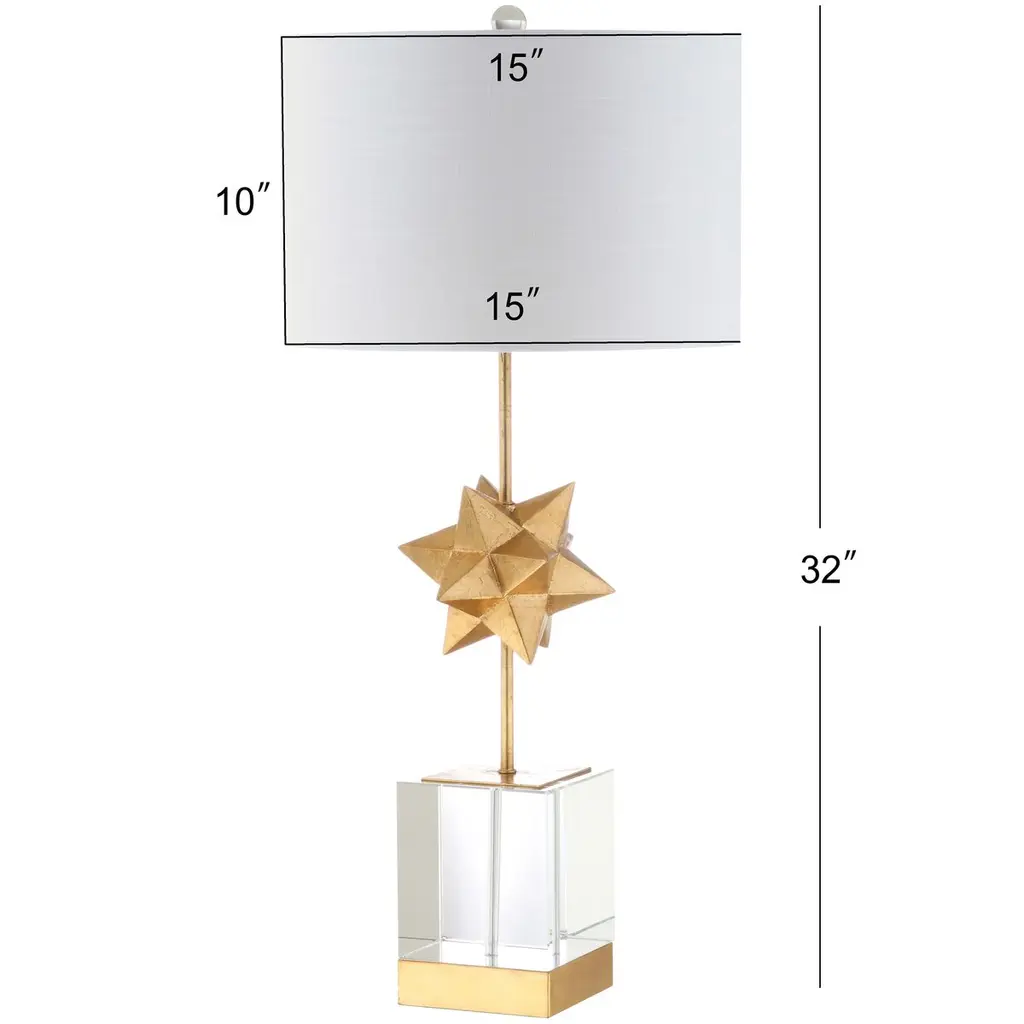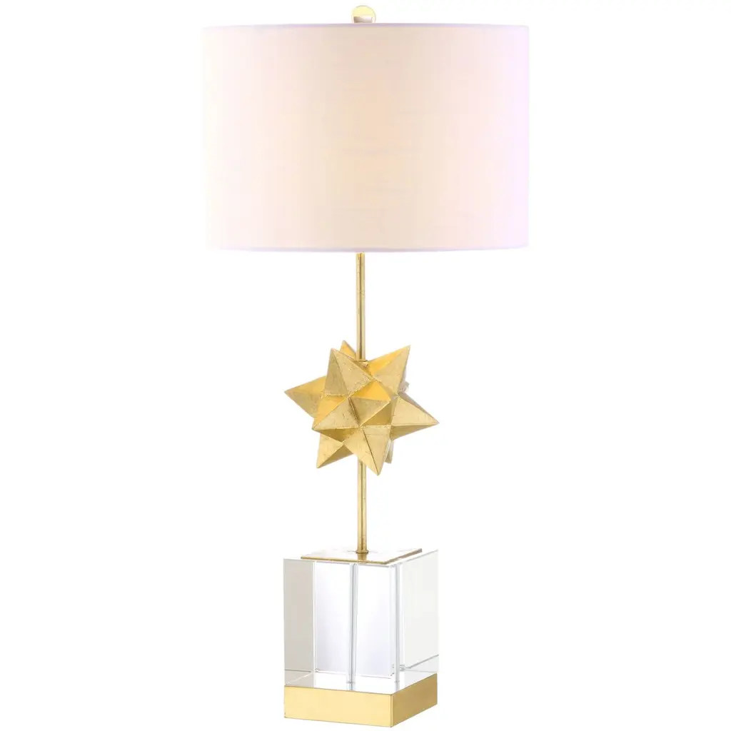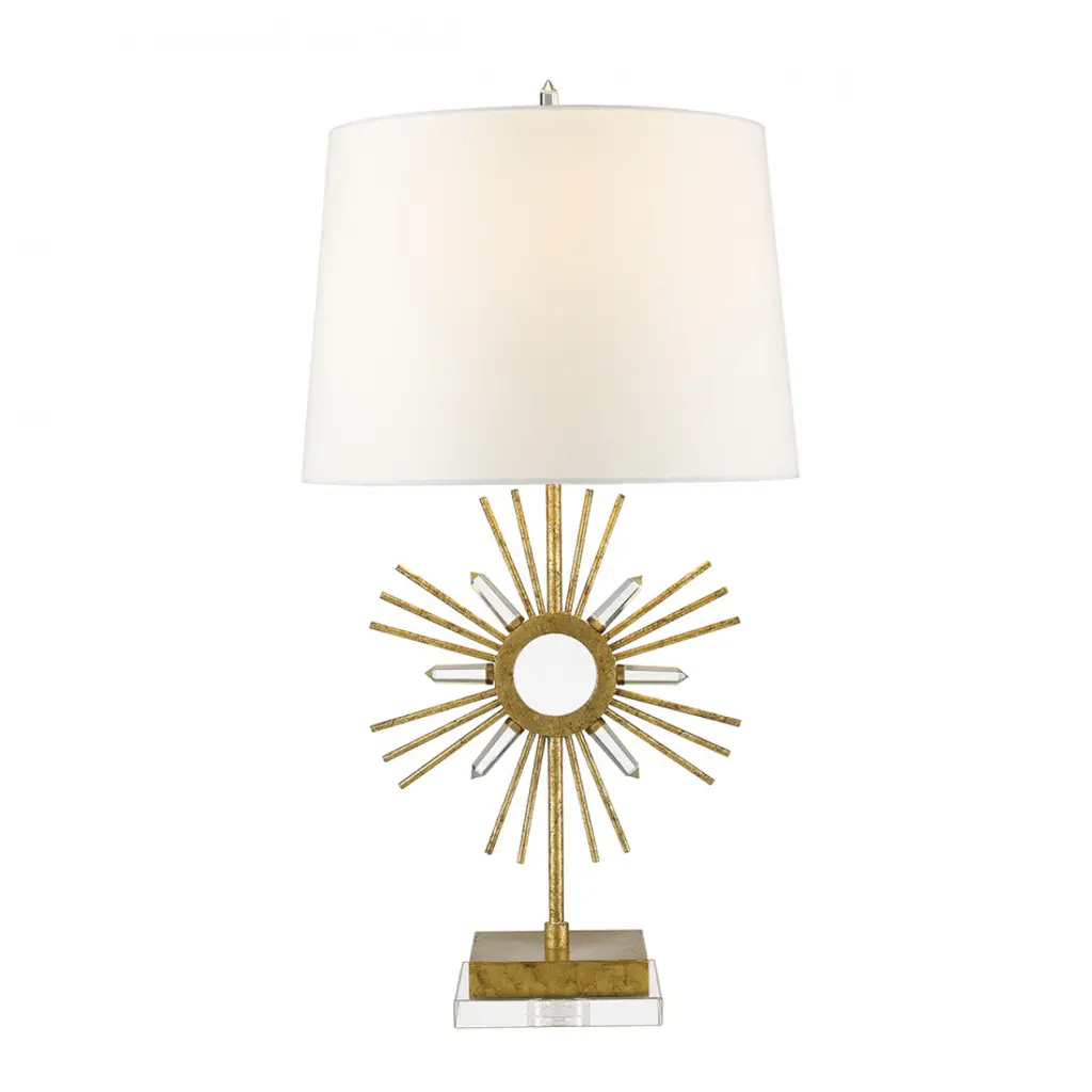 This table lamp definitely has star power. Its multifaceted golden starburst hovers atop a crystal cube with a golden base. The linen shade and the silk-wrapped cord add to the glamour.