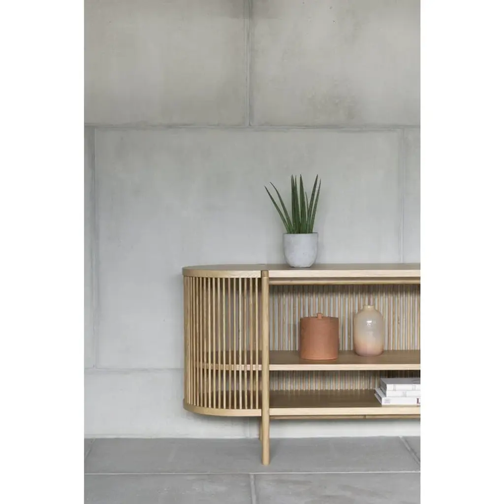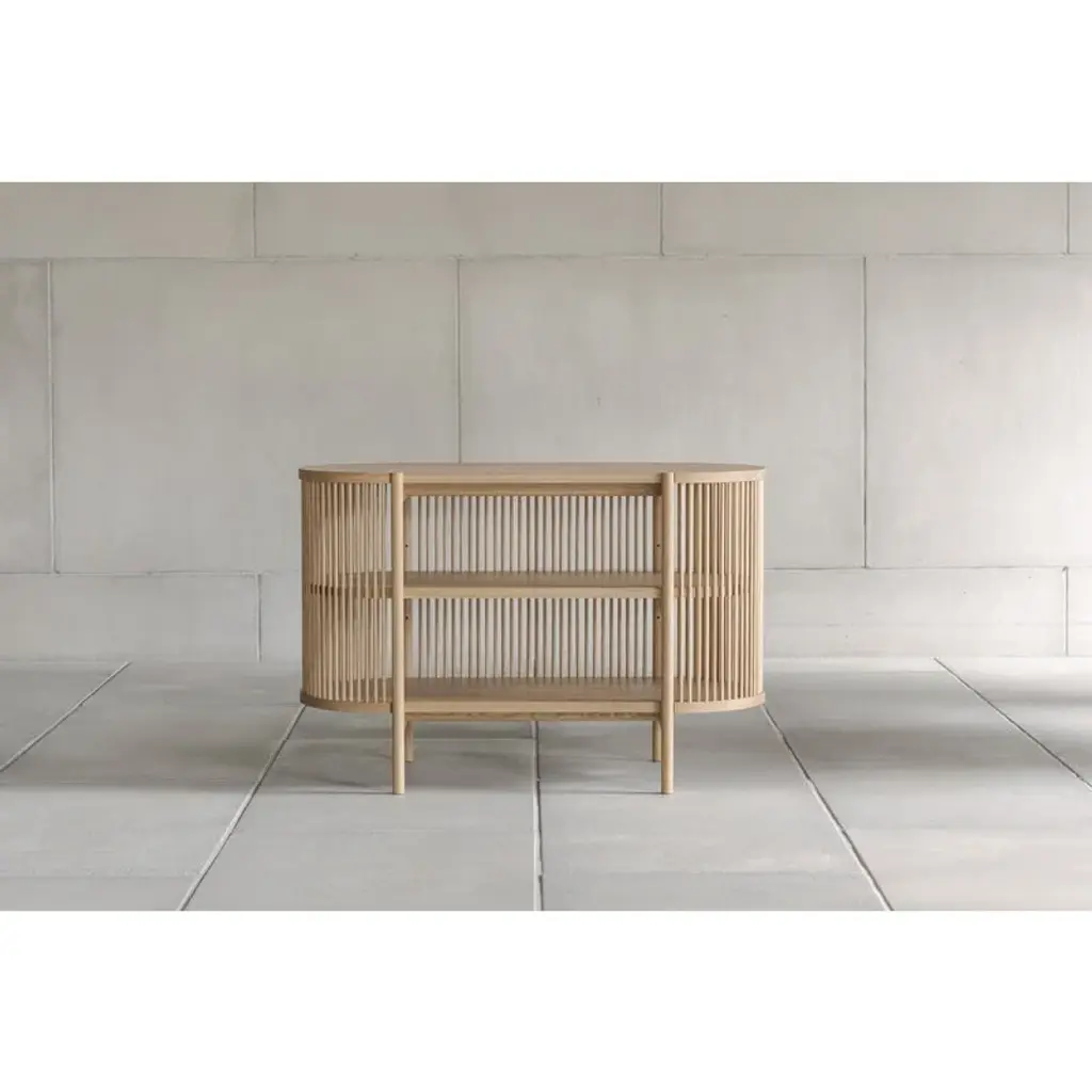 Petit Bastone is a smaller version of the timeless and sculptural sideboard designed by master cabinetmaker Antrei Hartikainen. Manufactured by the Finnish brand Nikari, the solid wood sideboard features sides made of wooden slats that filter light inside and cast beautiful shadows around it. The thick shelves and top provide a stable structure and contrast with the semi-transparent sides. Petit Bastone is like a piece of art itself, creating a captivating setting for your favorite items in any room. Fill it with books and decorative objects in the living room, use it for storing tableware in the kitchen. Thanks to the open structure, you can also place a houseplant or decorative lamp inside it.