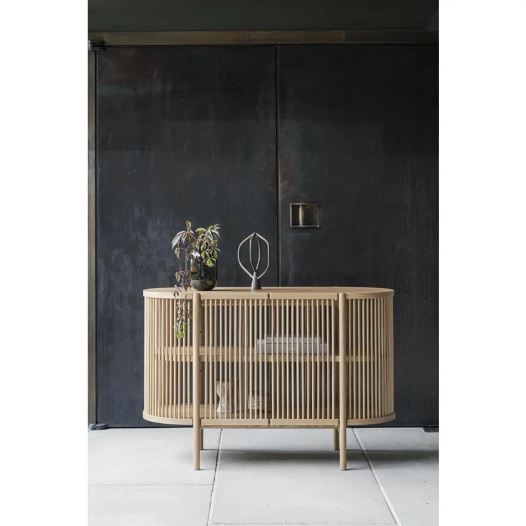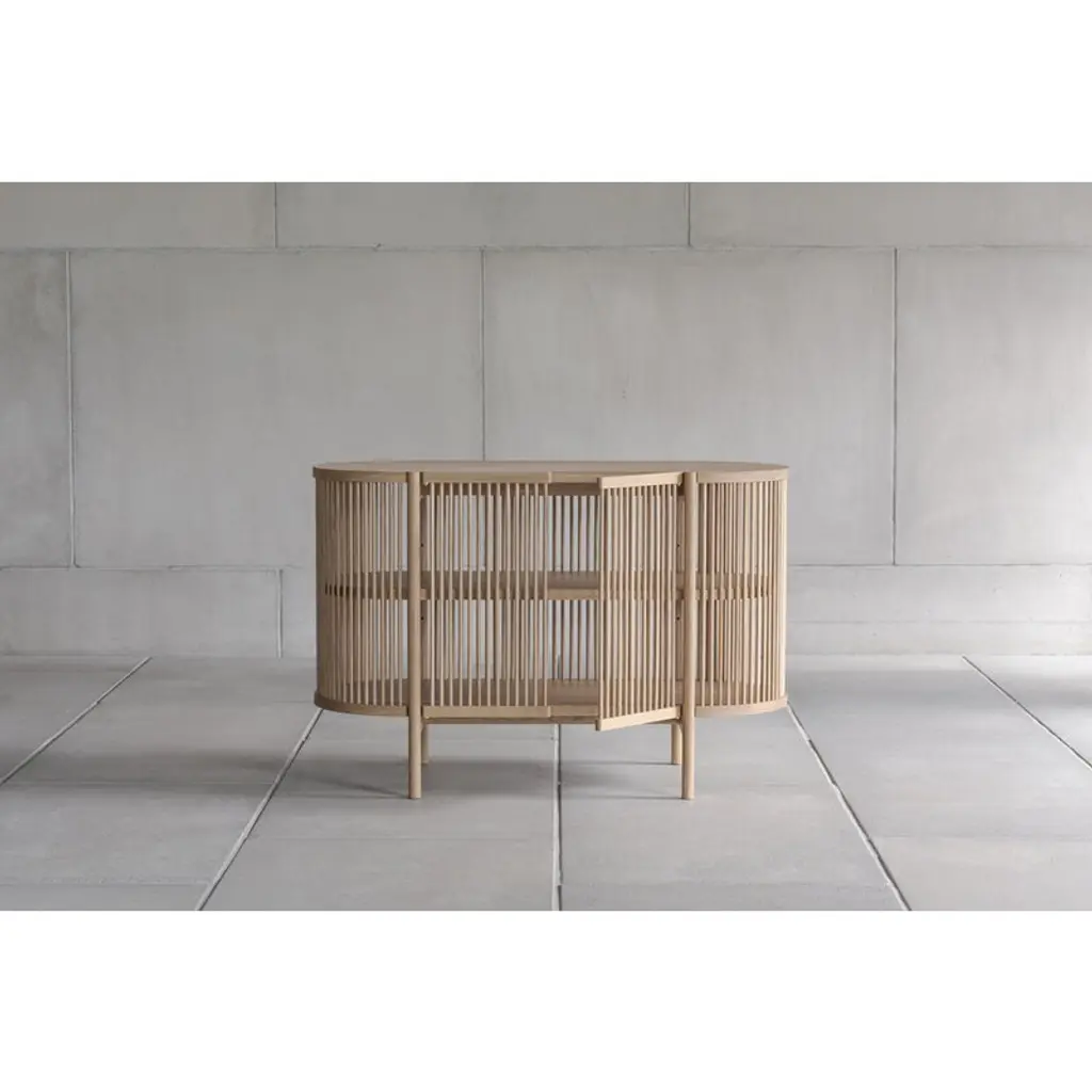Petit Bastone is a smaller version of the timeless and sculptural sideboard designed by master cabinetmaker Antrei Hartikainen. Manufactured by the Finnish brand Nikari, the solid wood sideboard features sides made of wooden slats that filter light inside and cast beautiful shadows around it. The thick shelves and top provide a stable structure and contrast with the semi-transparent sides. Petit Bastone is like a piece of art itself, creating a captivating setting for your favorite items in any room. Fill it with books and decorative objects in the living room, use it for storing tableware in the kitchen. Thanks to the open structure, you can also place a houseplant or decorative lamp inside it.