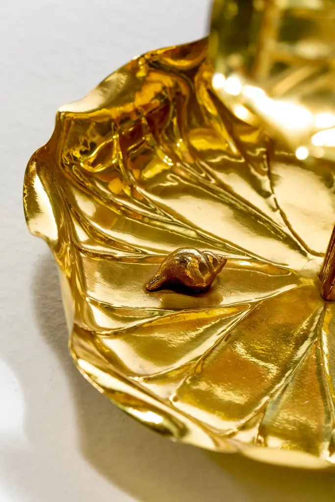 Inject a warm golden glow and an organic sensibility into your space with this petite 1960s newly polished lotus flower table lamp by Feldman Lighting Company often described as in the style of Tommi Parzinger. The lamp features a central lotus flower stem and two branches finished with leaf and lotus bulb end pieces. Beautifully detailed and etched, each brass piece is carved with organic markings for a more natural organic look. A small snail rests peacefully atop the lotus leaf base. This particular lamp is the smallest in size of the Feldman Lotus Flower lamp collection and works perfectly on a bedside table, in a kitchen nook or desk, atop an entry console or anywhere you'd like to add a warm and elegant golden glow. The lamp was professionally rewired and professionally polished and lacquered to retain the brass glow.Photographed along with and also currently available in our shop -Pair of Hollywood Regency Tall Brass Lotus Lamps by Feldman Lighting circa 1960sLarge Brass Lotus Fixture by Feldman Lighting Company in the Style of ParzingerParzinger Style Large Brass Centerpiece Lotus Candle Holders by Feldman LightingFeldman Brass Lotus Candle Holders in the Style of ParzingerFeldman Brass Lotus Candle Sticks in the Style of ParzingerFeldman Brass Lotus Centerpieces in the Style of ParzingerParzinger Style Lotus Pendant Light by Feldman Lighting Company, circa 1950s