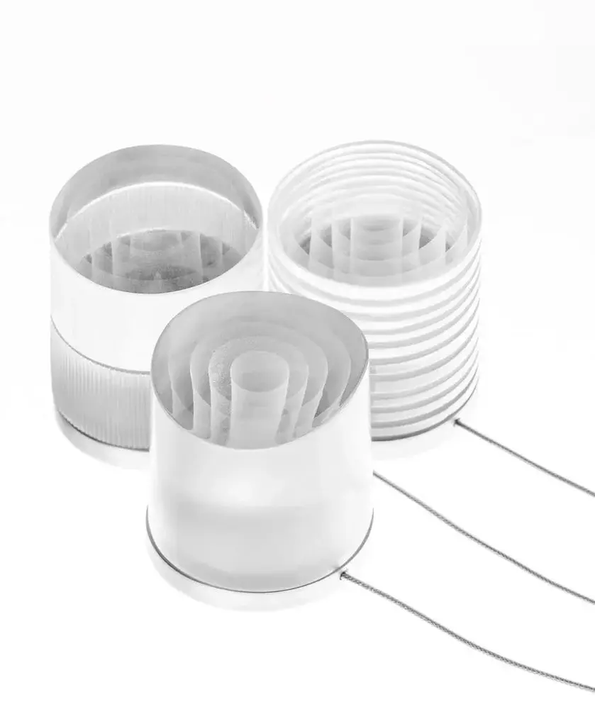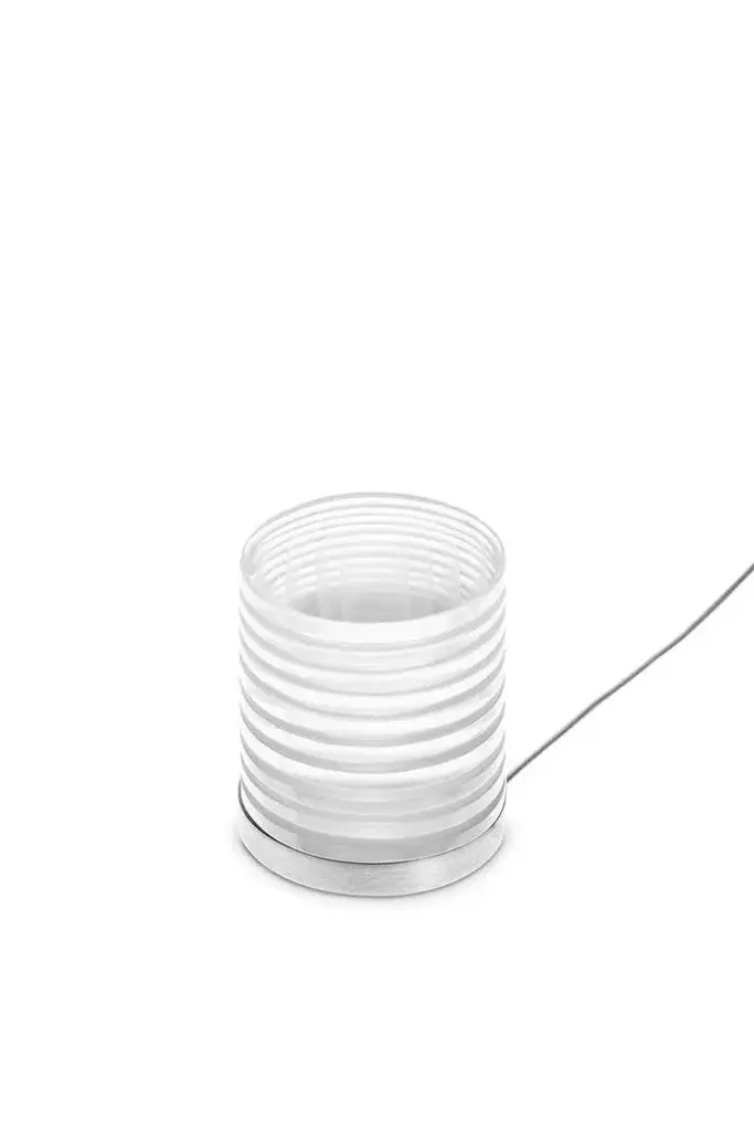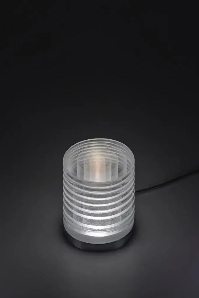 Designed by Federico Peri for Purho Murano, Petite is a corded table lamp of restrained dimensions (diameter 60 x height 80mm) made entirely of Murano glass. Part of the Incisioni collection consisting of vases, candelabra, candle holders and ash trays linked by a careful search for the potential of glass engraving applied to the world of design, Petite is distinguished by a thin base in brushed aluminium and the linearity of the cylindrical body covered with banding, pleating and ribbed cuts. Three models are available: Petite Silk characterized by banding running up to the slightly concave upper surface, Petite Doll It composed of one smooth section with the other half covered by a dense knurling, Petite Stripe covered with thick horizontal lines. Petite — together with its larger twin Haute — is a collection of gracious lamps and unique design made even more special by the three chosen colours: crystal, smoke, rosé. Labeled by Maker