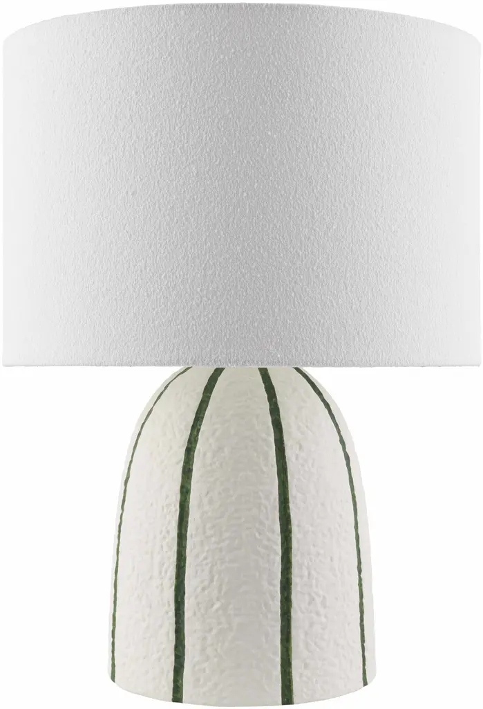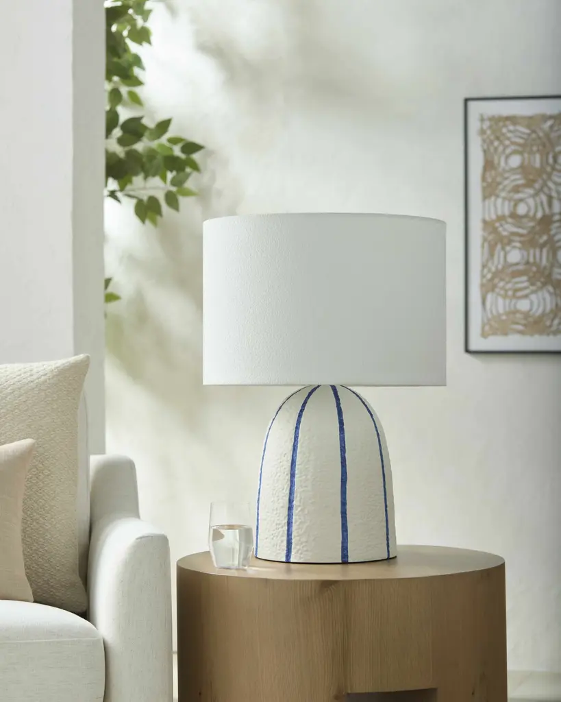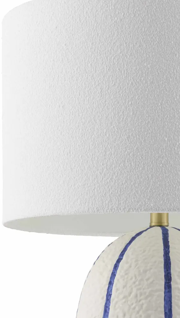 Collection: Petrijanec Colors: Beige, White, Metallic - Brass, Translucent, Muted Blue Material: Body: Ceramic / Base: Iron / Shade (Outside): Linen / Shade (Inside): Polyester Styles: Traditional Made In: Cambodia Lighting Type: Accent Table Lighting Base: Iron Shade Material: Linen, Polyester Shade Color: White, Beige Cord Length: 6' Switch Type: On/Off Number of Bulbs: 1 Socket Type: E-26 Bulb Wattage: 100W