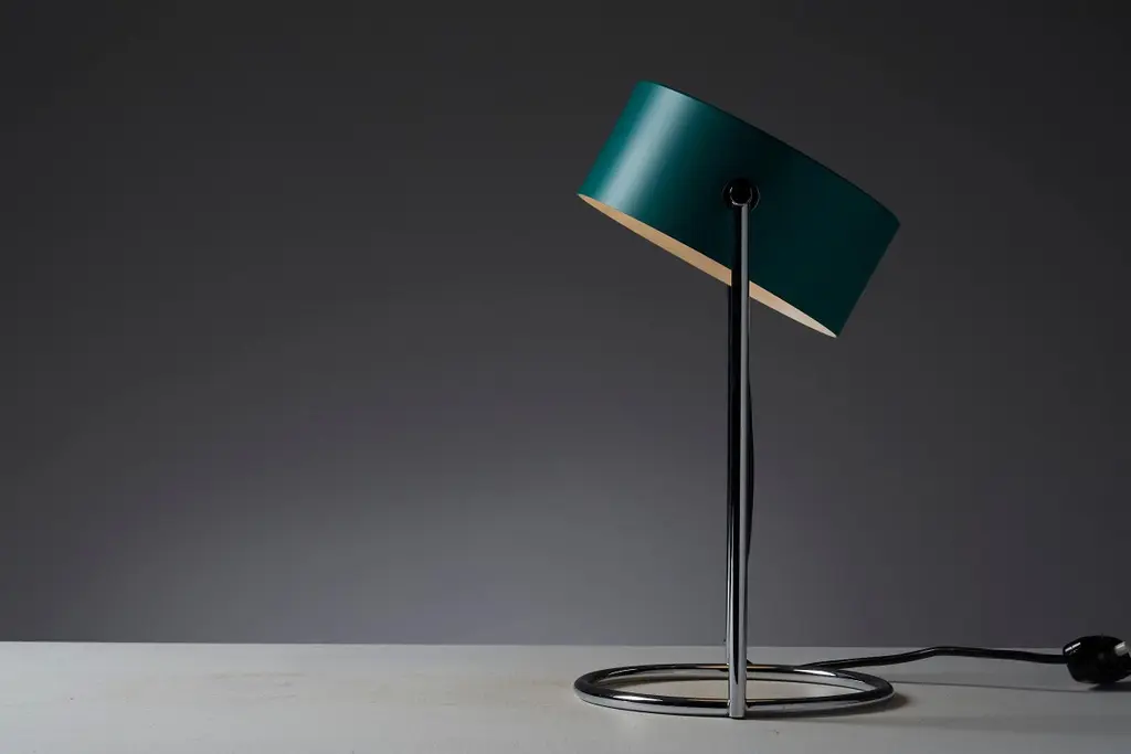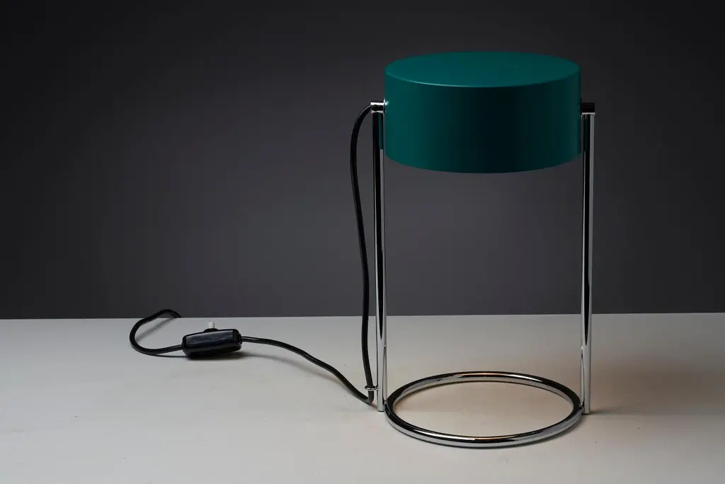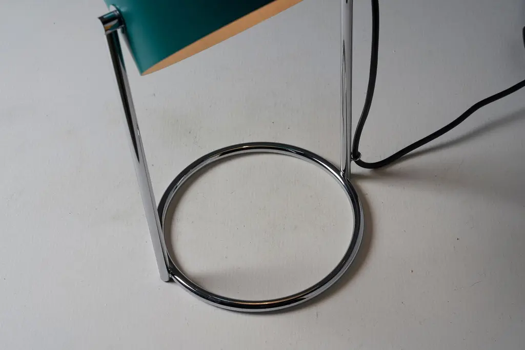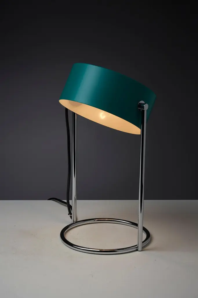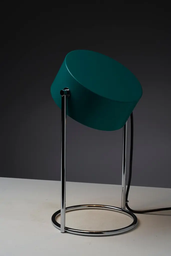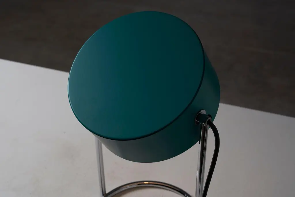 This is an elegant table lamp in stunning condition, featuring a petrol green shade made of lacquered metal that is fully adjustable around its axis. The shade is complemented by a chromed metal base, which perfectly matches its color and style. The lamp still has its original tags, adding to its charm and vintage appeal.