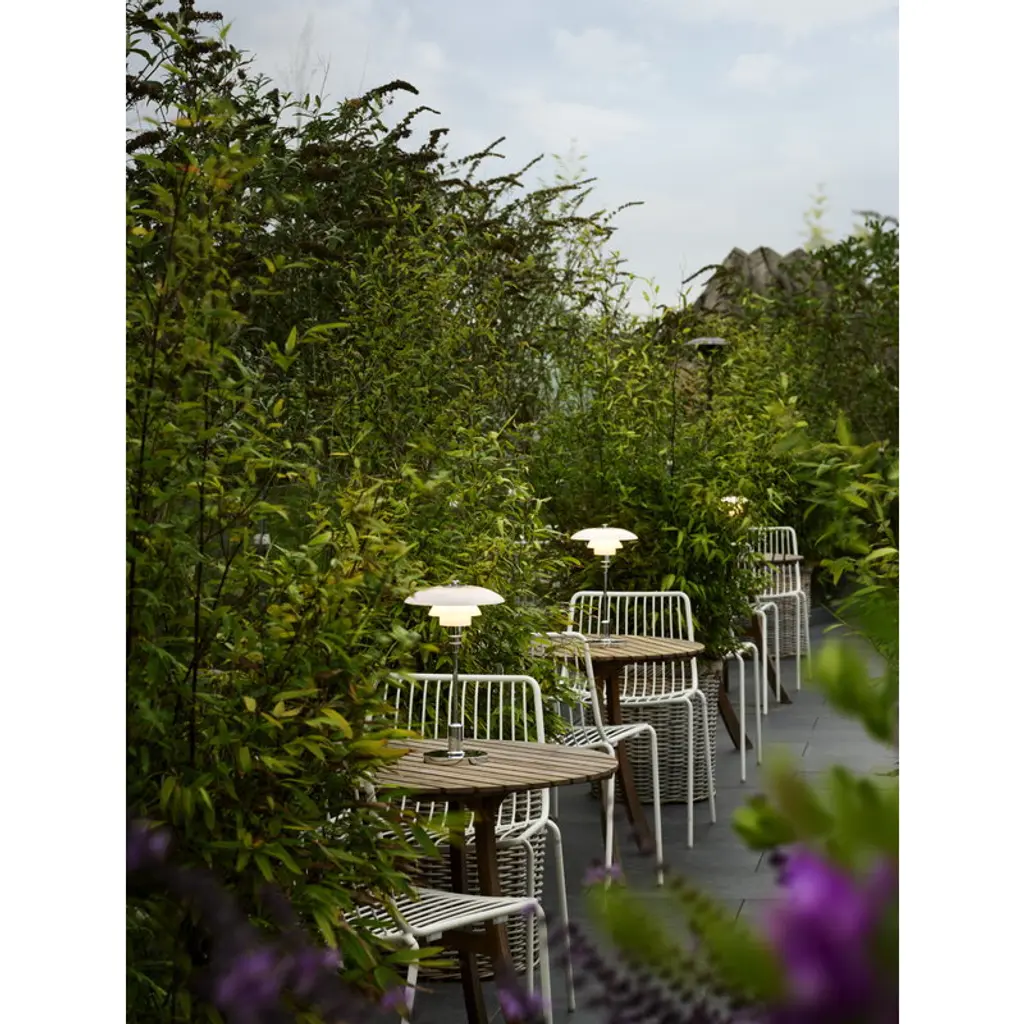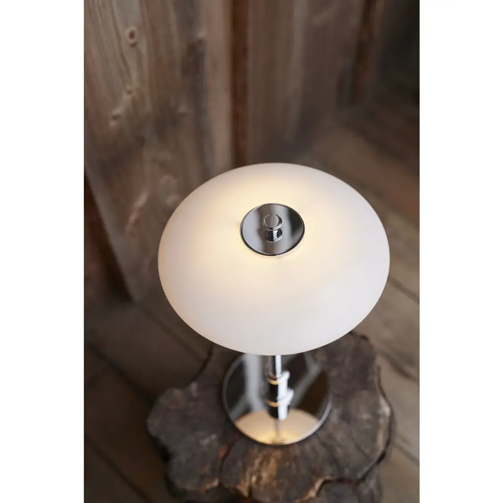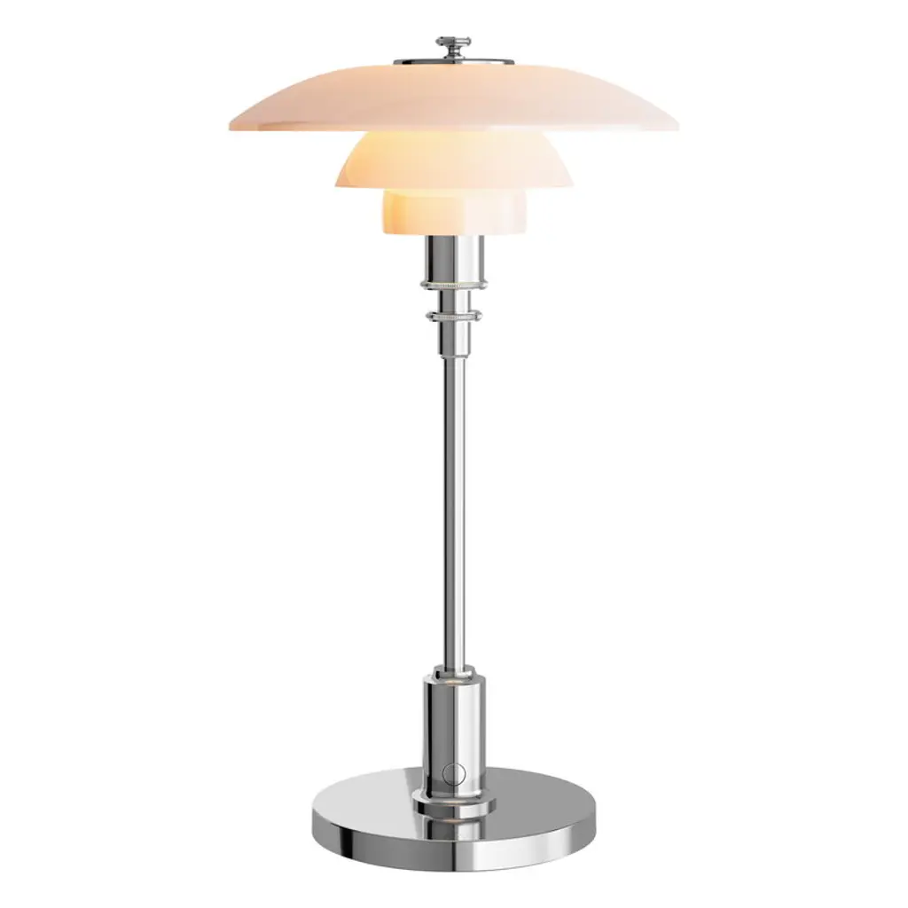 Louis Poulsen's PH 2/1 Portable is a cordless, rechargeable version of Poul Henningsen's classic table lamp. The high luster chrome base gives the PH 2/1 table lamp a modern, sophisticated look. Like the other luminaires in the PH collection, PH 2/1 Portable features an innovative three-shade system developed by Poul Henningsen in the 1920s. The three mouth-blown opal glass shades with a sandblasted inner surface form a sculptural lamp that provides a pleasant, glare-free light and brings timeless elegance to any space.