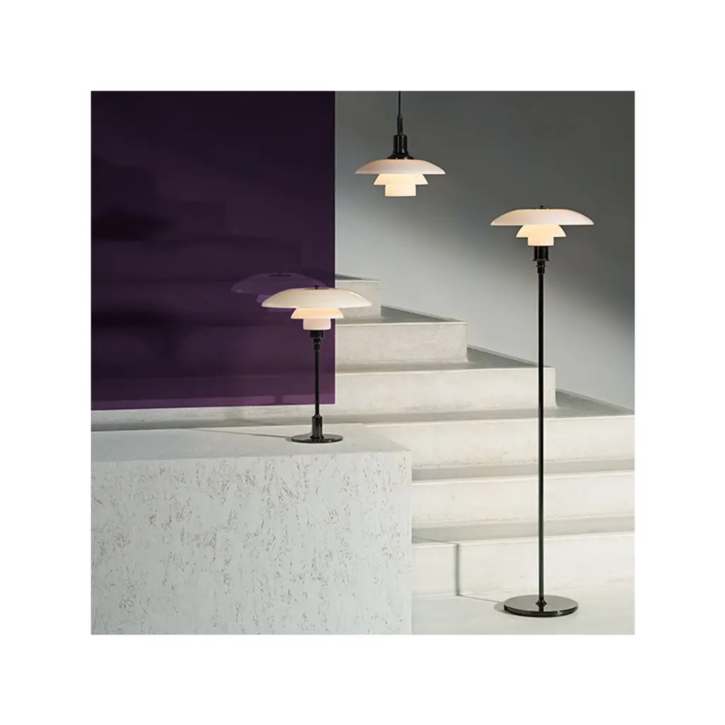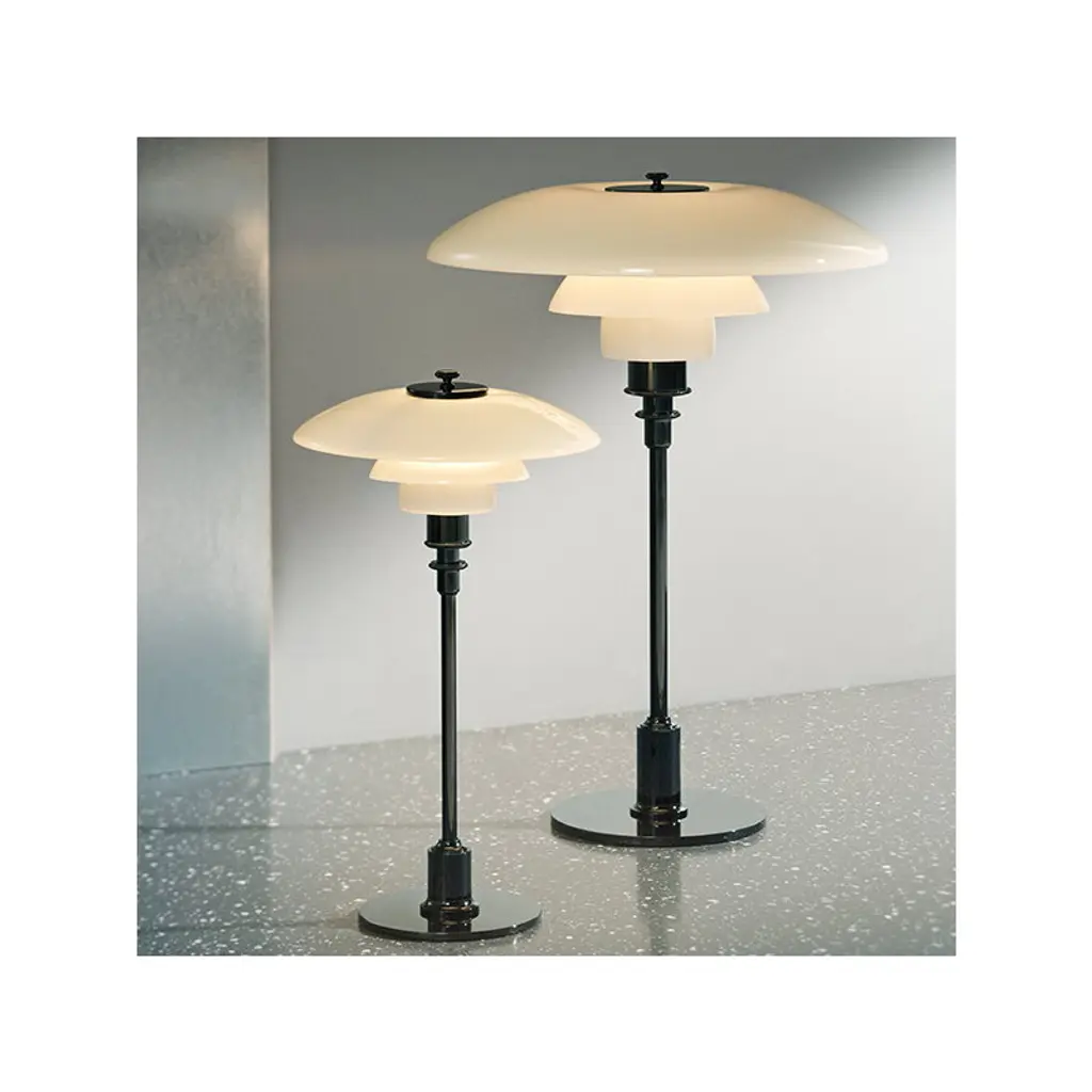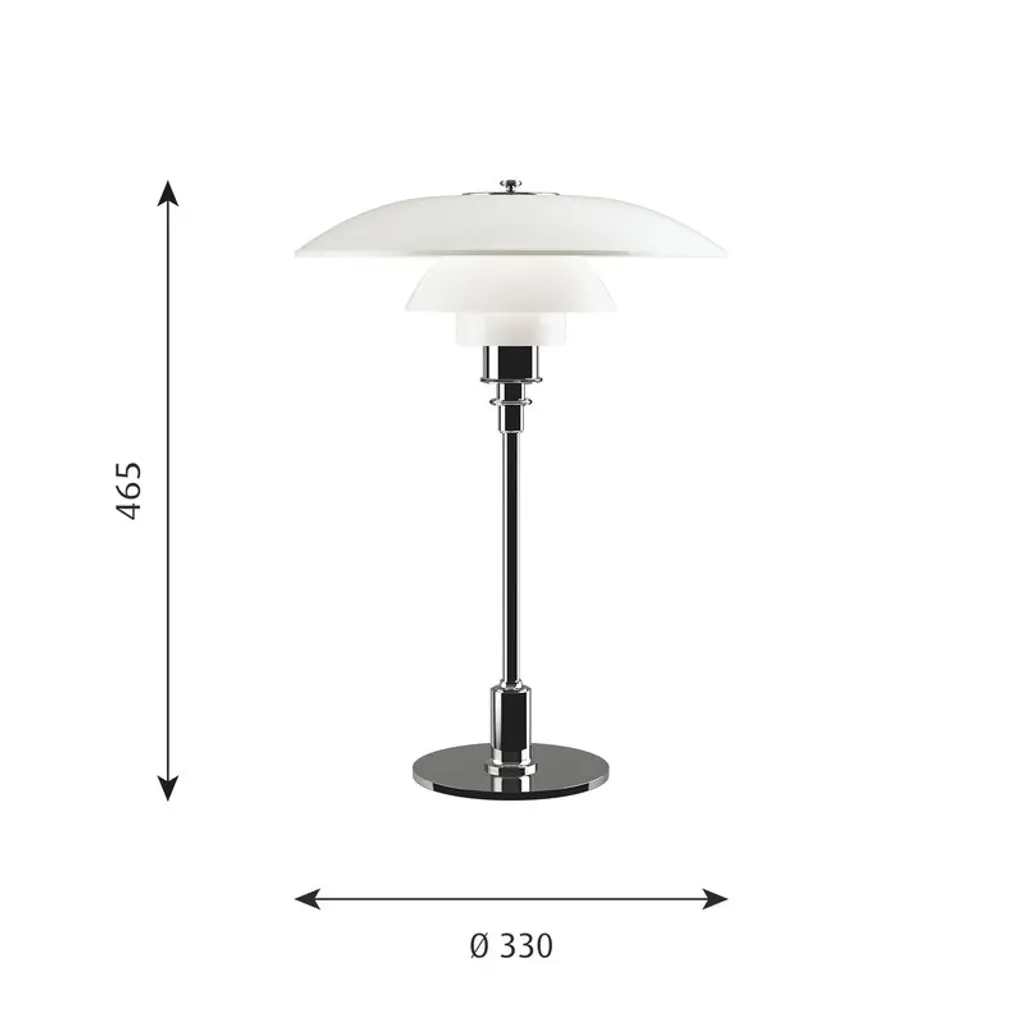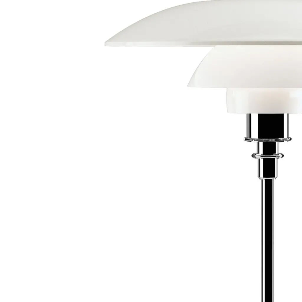 The classic PH 3½–2½ table lamp from Louis Poulsen features the innovative three-shade system Poul Henningsen created in the 1920s. The three mouth-blown opal glass shades with a sandblasted inner surface form a sculptural lamp that provides a pleasant, glare-free light and brings timeless elegance to any space. The chrome plated base gives the PH 3½–2½ table lamp a modern, industrial look.