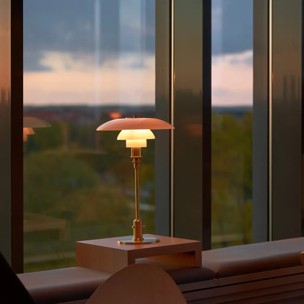The PH 3/2 Table Lamp is a refined example of Poul Henningsen’s innovative three-shade system, developed to provide glare-free, evenly distributed light. Originally conceived in the 1920s, this system uses a logarithmic spiral to ensure consistent illumination across the shades. Crafted from mouth-blown glass, it offers a soft, diffuse light.