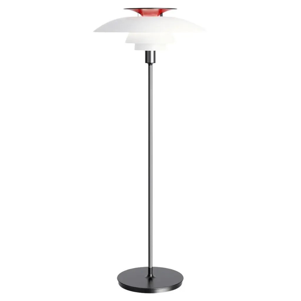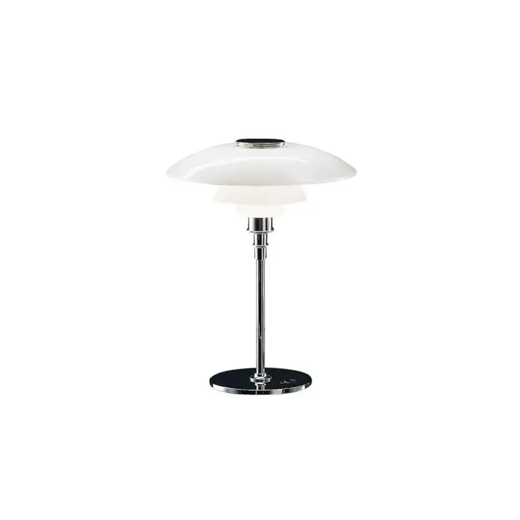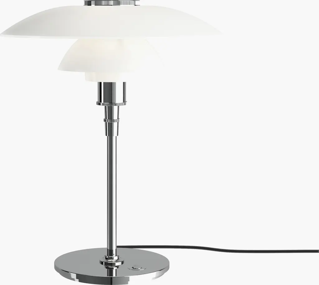 Poul Henningsen designd the three-shade system during 1925/1926. The first lights using the system were designed for an exhibition in Paris. His work with Louis Poulsen continued until his death in 1967. Throughout his life, PH sought to create glare-free lighting; aiming to direct light where it was most needed, and creating soft shadows while using incandescent bulbs as a light source. PH 4/3 Table is a member of the three-shade family. Approximately one thousand different models have been produced over the years and consisted of table, floor and wall lamps, as well as a number of different chandeliers, which were popular in the 30s for lighting private homes with high ceilings. There were countless combination options. The lights were available in different colors, as well as a range of sizes. The first shades were made of metal with a painted undersurface, such as white, gold or silver depending on whether diffuse, warm or cold light was desired. Glass was later introduced for the three-shade system. In addition to the downward-directed light, glass lamps illuminated the room. PH was the first person to pursue a scientific approach to light and use the logarithmic spiral as a basis. By using a design based on the logarithmic spiral he achieved even distribution of light over the entire curve of the shade. This even light distribution, together with the diffuse reflection through the glass, made it possible to control glare and shadow. Each shade reduces the amount of light equally, due to their distance from the light source. The PH light model numbers refer to the shade size. Each top shade had a corresponding set of middle and lower shades. In the pure models, such as the 2/2, the top shade has a size of about 20 cm, with corresponding lower shades. PH 4/3 Table consists of an approximately 40 cm top shade, but uses lower shades from the 3/3 model. These hybrid models were introduced due to the desire to hang pendants at lower heights. The system was also used for wall, table and floor lamps. PH 4/3 Table in its current form was introduced in 1966.