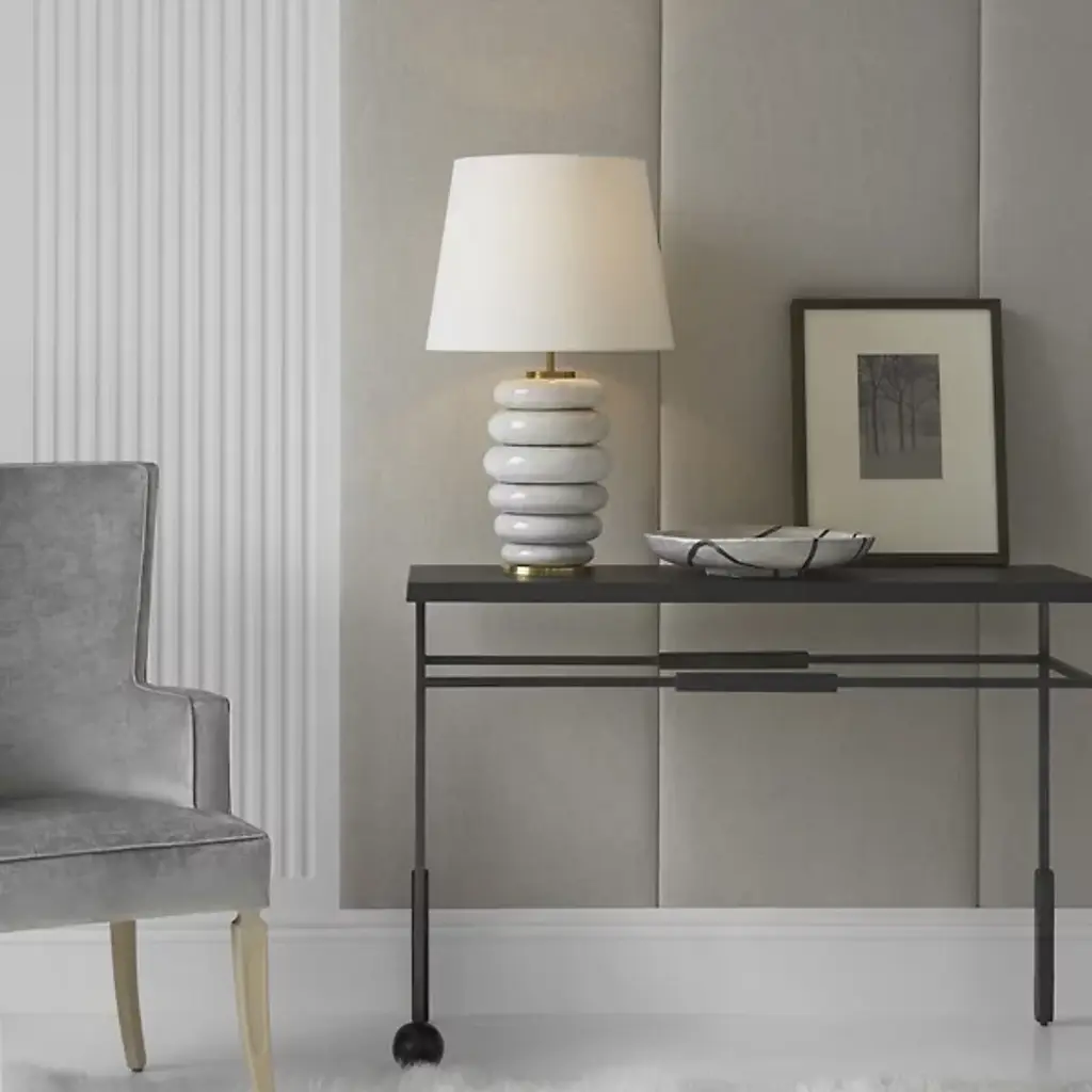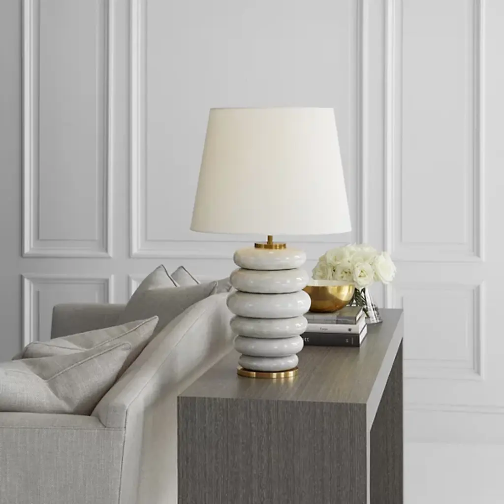 Give your decorative layout a look of artistry with the Phoebe Stacked Table Lamp by Visual Comfort Signature, formerly known as Visual Comfort. The lamp started with ceramic that has been finely worked into a stepstone style arrangement. Rounded-out slabs of varying widths neatly ascend from the lamp’s metallic baseplate to just below a cylindrical shade of linen. A single bulb emits brilliant light that fills your room with ease. This lamp is highly portable, allowing you to bring illumination to whichever living space you desire.