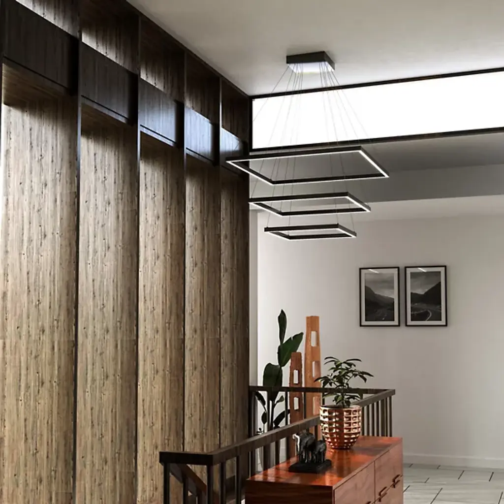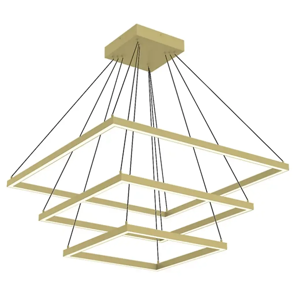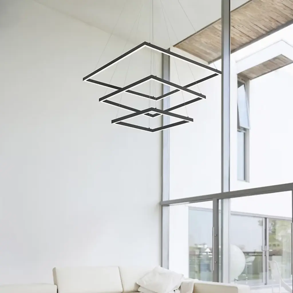 Bring contemporary drama to any space with the Piazza LED 3-Tier Chandelier by Kuzco Lighting. This open and airy fixture is suspended from a square canopy by a series of thin, adjustable wires. Aluminum bars form 3 tiers of open-form rectilinear square frames, each one smaller than the one above it. Along the perimeter of each frame is a continuous flow of energy-efficient LED lamping that emits a soft but generous glow through its opal diffuser.