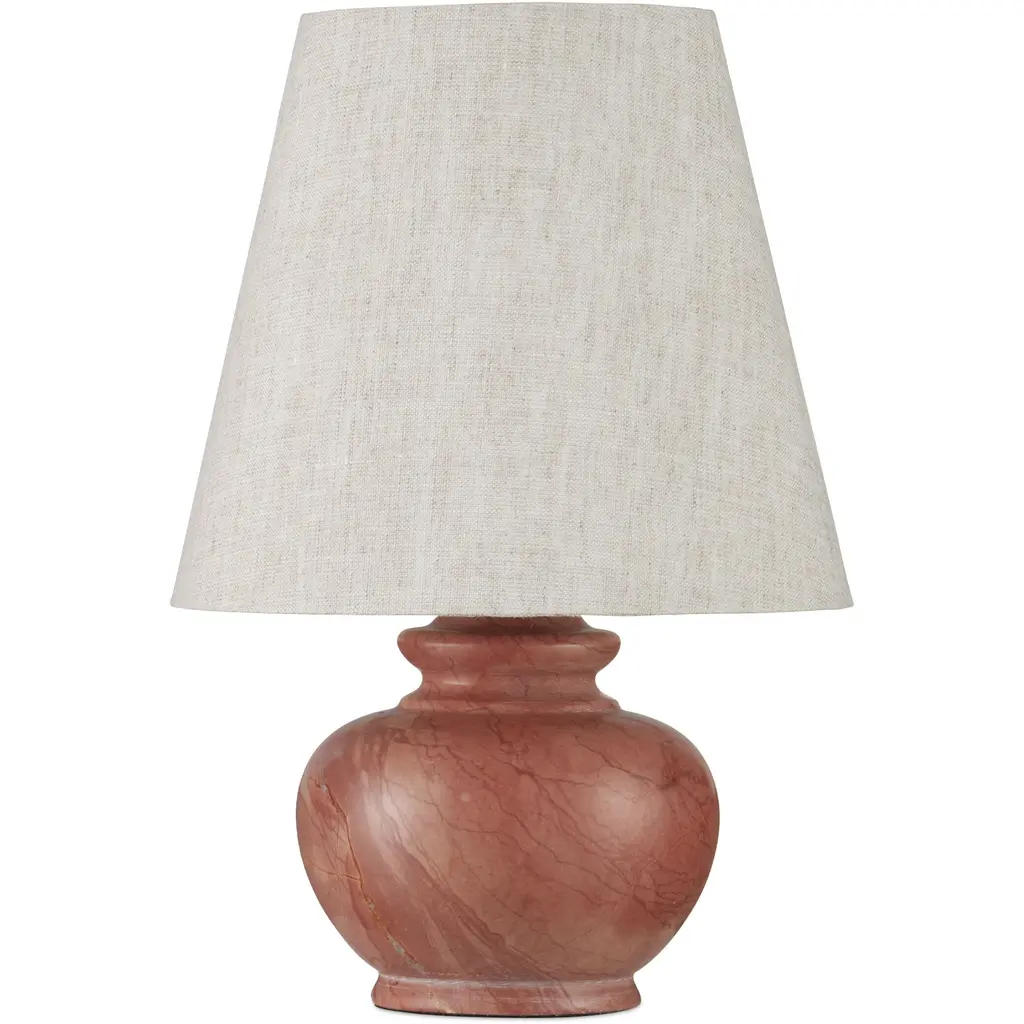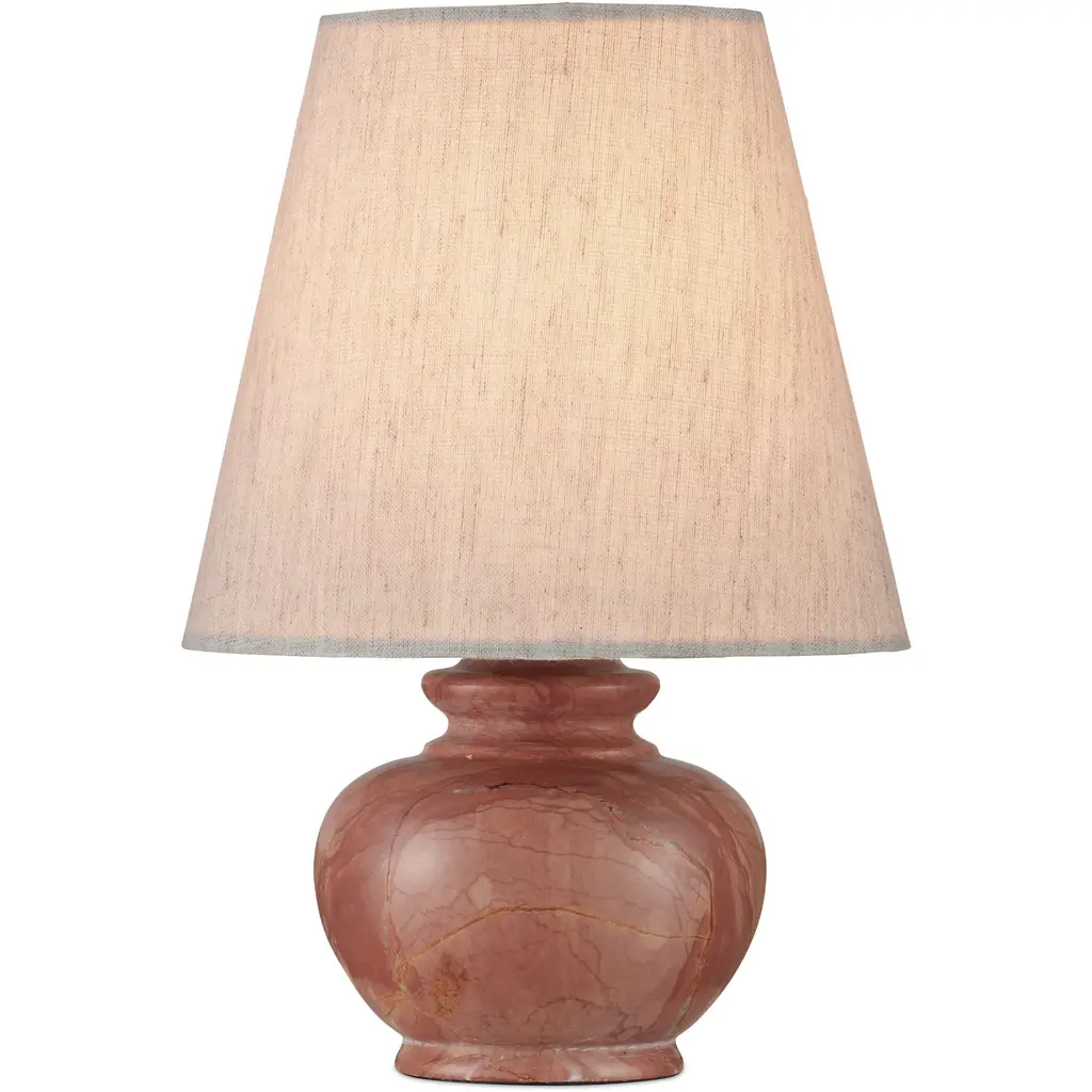 The Piccolo Pink Mini Table Lamp is a petite accent piece crafted from Rosa Cappuccino marble that features soft pink tones and natural veining to make each lamp unique. Inspired by a vintage design, it stands just 4.5 inches high to the bottom of the off-white linen shade, making it perfect for tucking into bookcases, shelving, or layered decorative vignettes.