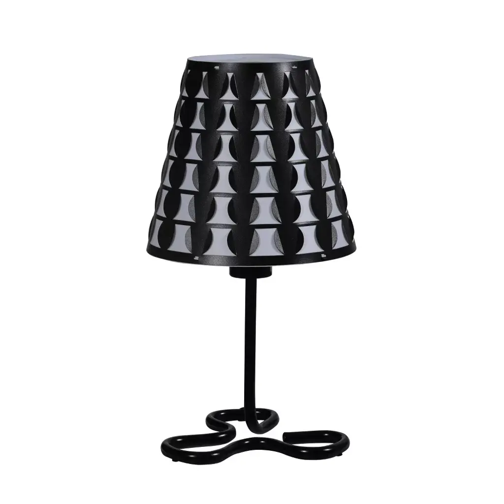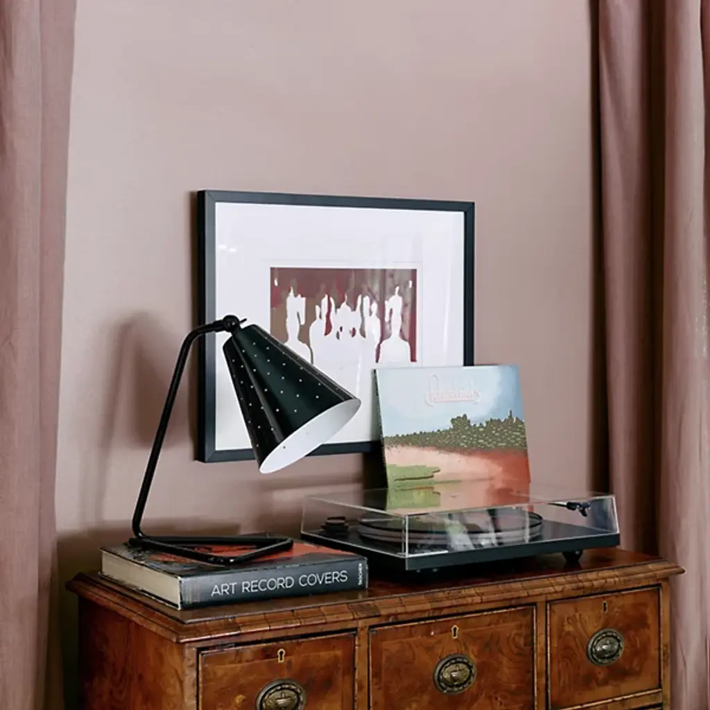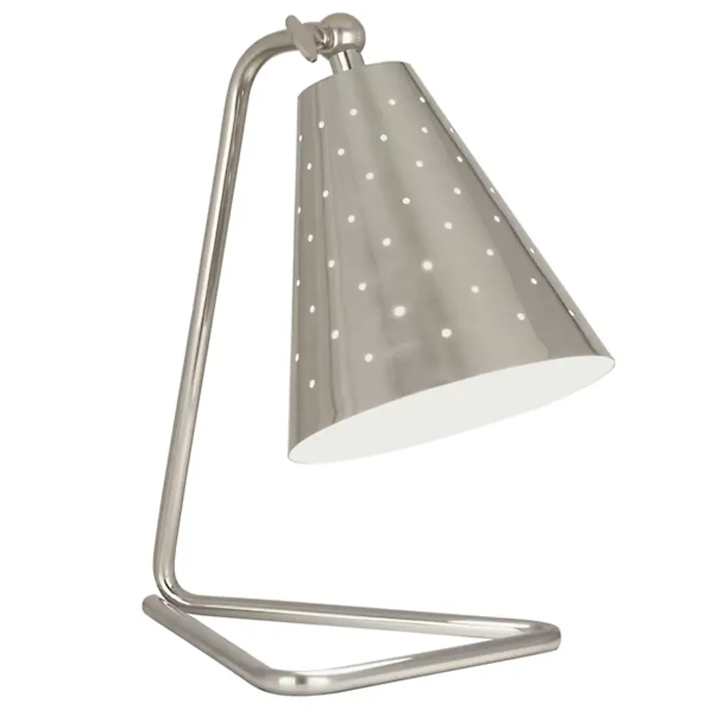The Pierce Accent Lamp from Robert Abbey is a modern take on a familiar tabletop silhouette. A sleek cone-shaped shade made of perforated steel contains a single light source, allowing its glow to be funneled downward onto the table while sending sparkling dots of light through its shade. A slender arm seamlessly flows from the top of the shade into a triangular base below it, steadying the piece and offering a clean, modern aesthetic that elevates any space as it brightens.