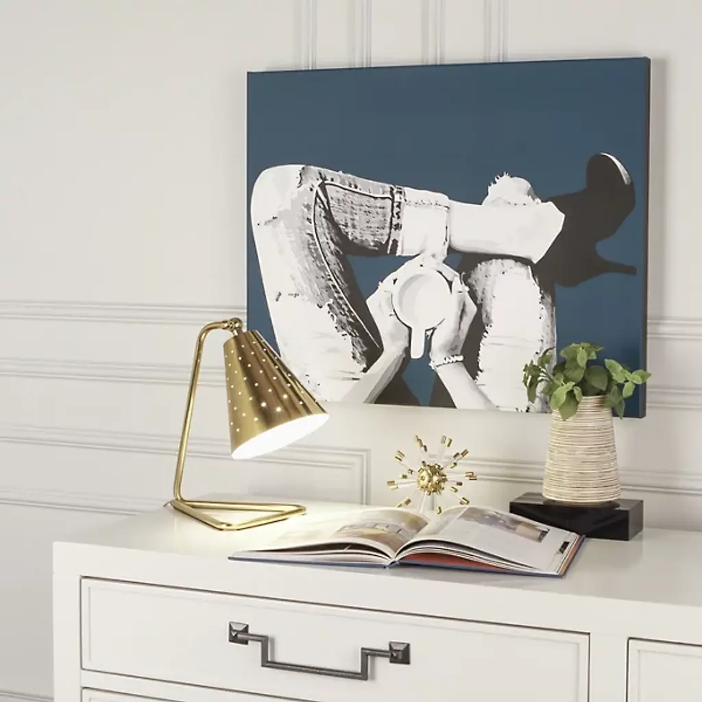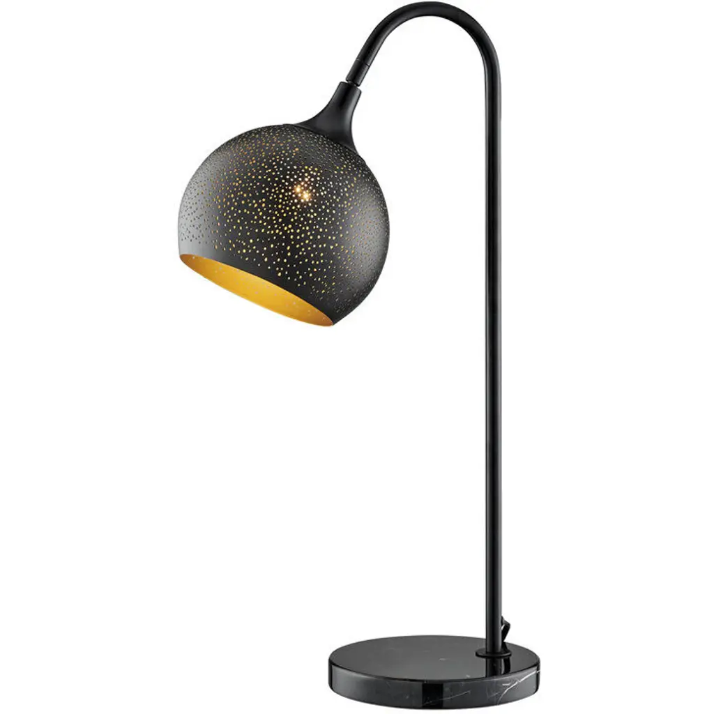 The Pierce Accent Lamp from Robert Abbey is a modern take on a familiar tabletop silhouette. A sleek cone-shaped shade made of perforated steel contains a single light source, allowing its glow to be funneled downward onto the table while sending sparkling dots of light through its shade. A slender arm seamlessly flows from the top of the shade into a triangular base below it, steadying the piece and offering a clean, modern aesthetic that elevates any space as it brightens.