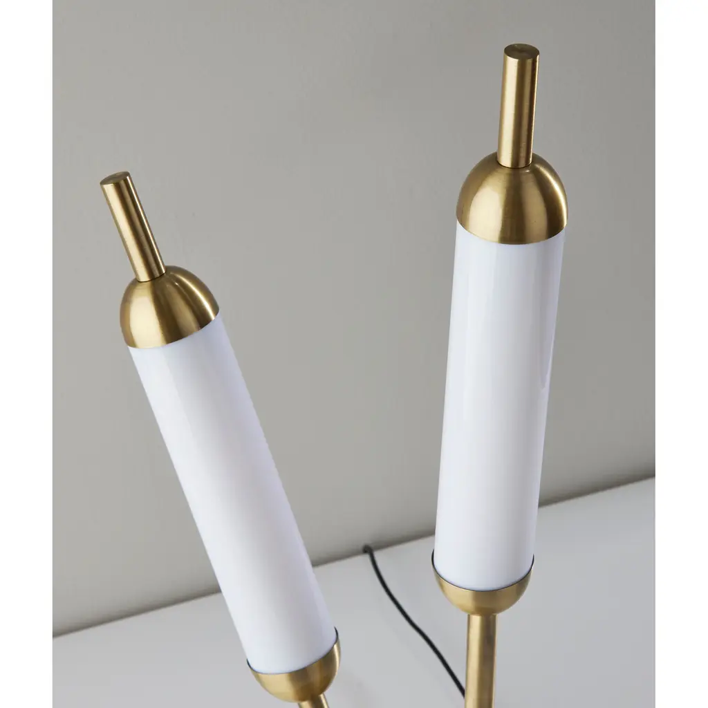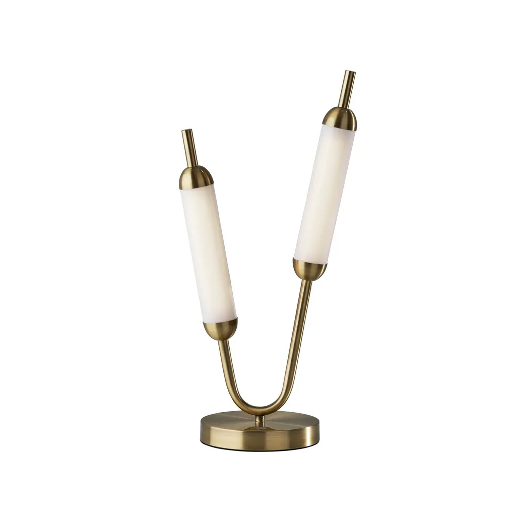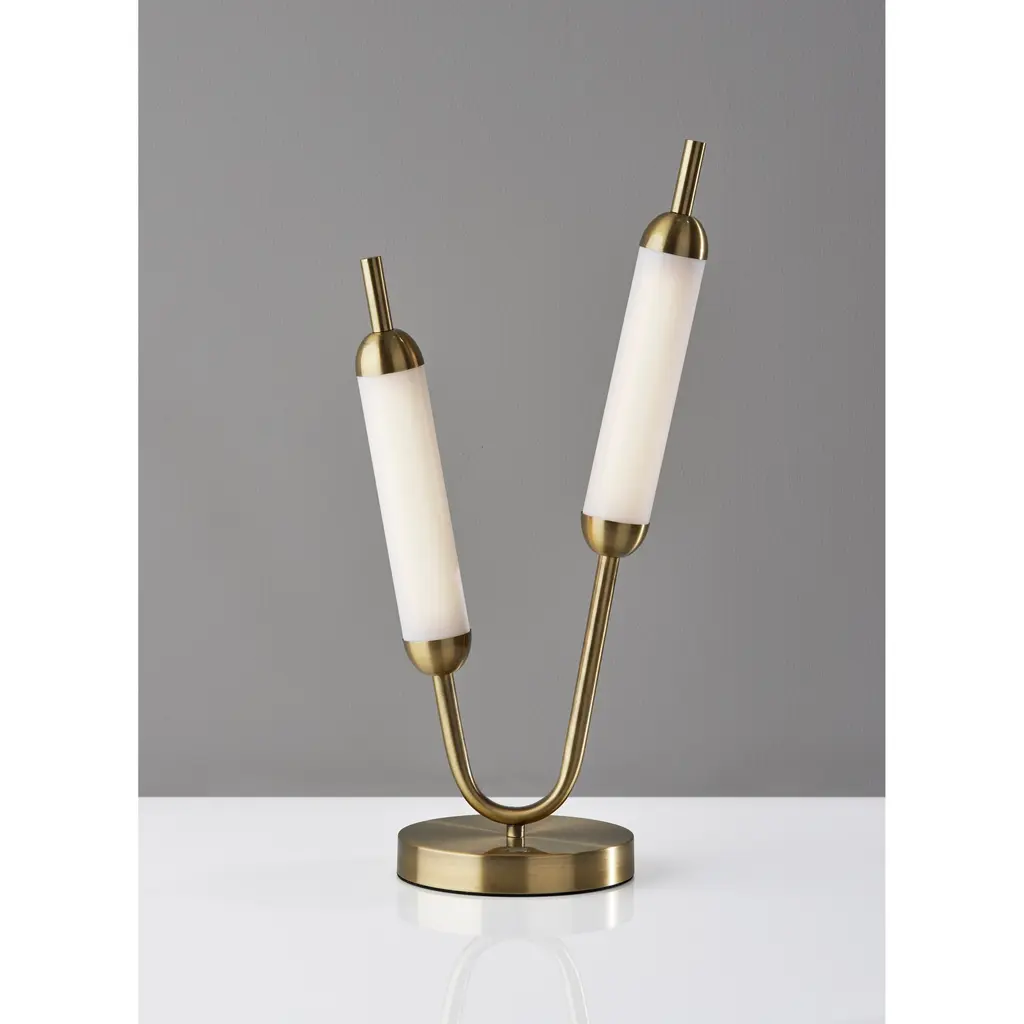 The 21.5″ tall Pierce LED table lamp's blend of materials and stunning reed design creates a unique statement piece for any space. With a 7″ round diameter base in an antique brass finish, the lamp features two short and slender poles, each leading to a frosted acrylic cylindrical shade measuring 2″ in diameter and 8.5″ tall. Each light is an integrated 6W LED controlled by a touch switch located on the base, giving you the ability to select between three brightness levels at the touch of a finger. Complete your décor with the coordinating Pierce LED floor lamp. Features: The Pierce LED table lamp's blend of materials and stunning two prong design creates a unique statement piece for any space. Light is controlled by a touch switch located on the base, giving you the ability to select between three brightness levels at the touch of a finger. 6 Watts of bright, flicker free LED lighting from each shade is softly diffused by frosted acrylic tube shaped shades. 21.5" height is ideal for desks, accent tables, and nightstands. Additional Specs: Shade Dimensions: 2" Dia. X 8.5"H Shade Material: Frosted Acrylic Shade Shape: Cylinder Tube Diameter: .625" Light Settings: 3 level dimmer Bulb Required: 2 x 6W LED LED Info: CRI: 80; Color Temp: 3,000K 1000 lm Switch: Touch Switch on Base Base Finish: Antique Brass Base Measurement: 7" Dia. Cord Length 5FT