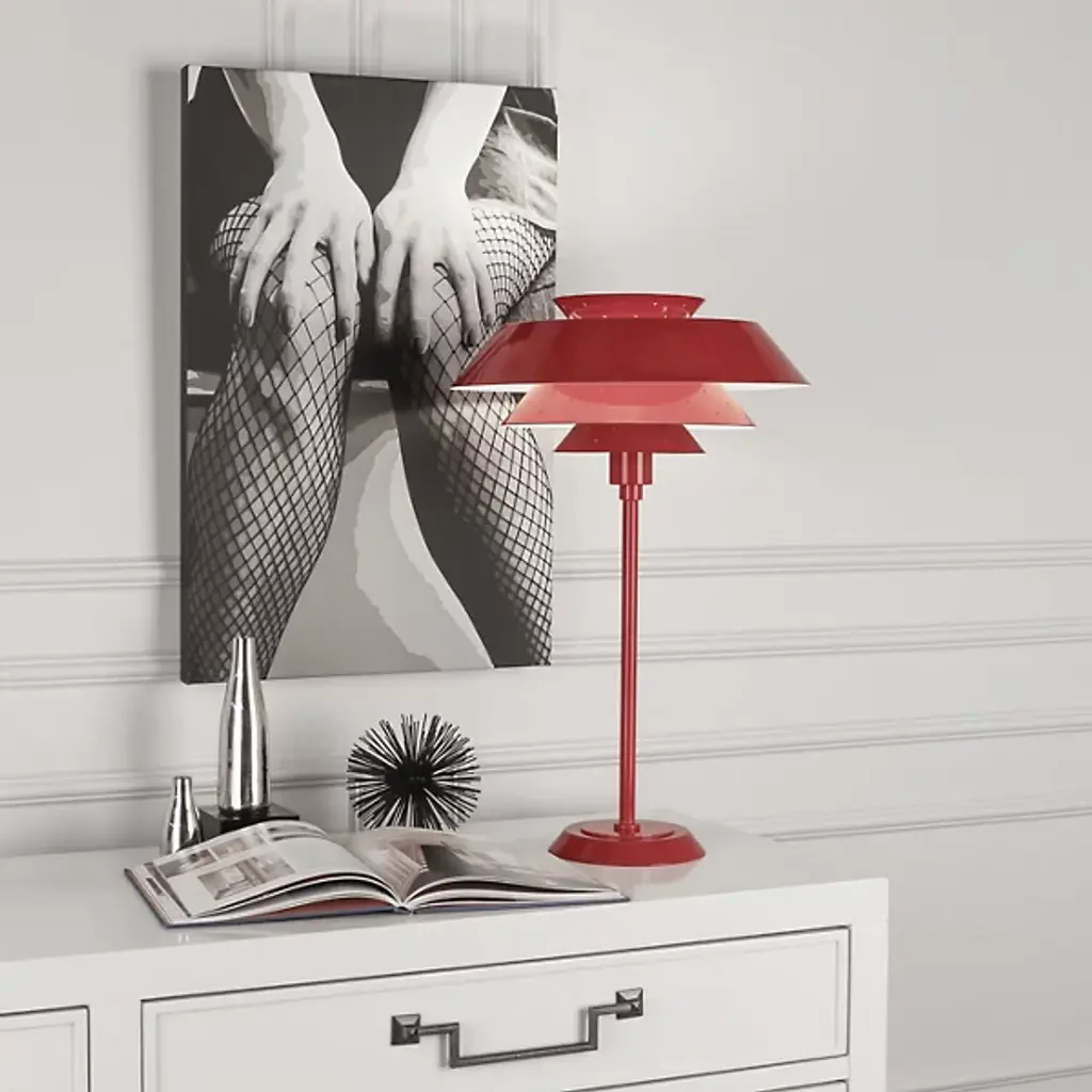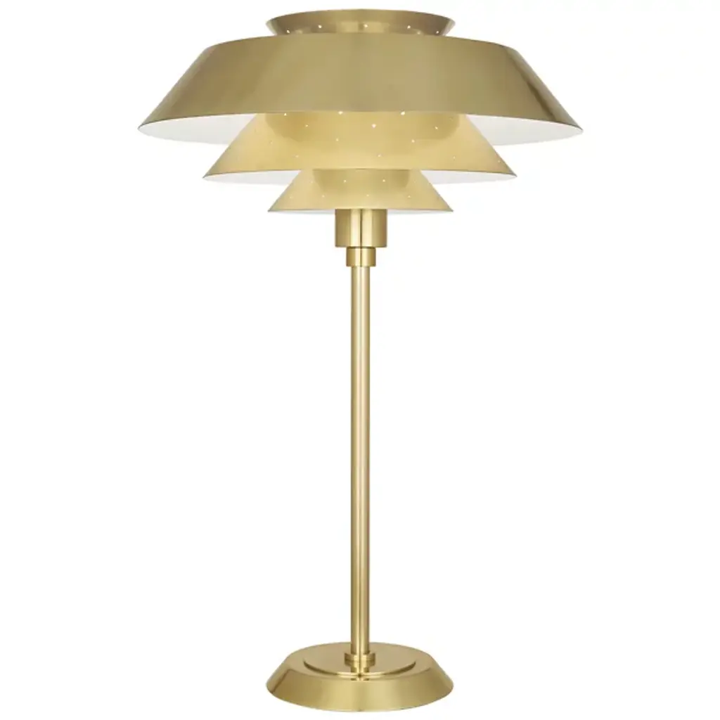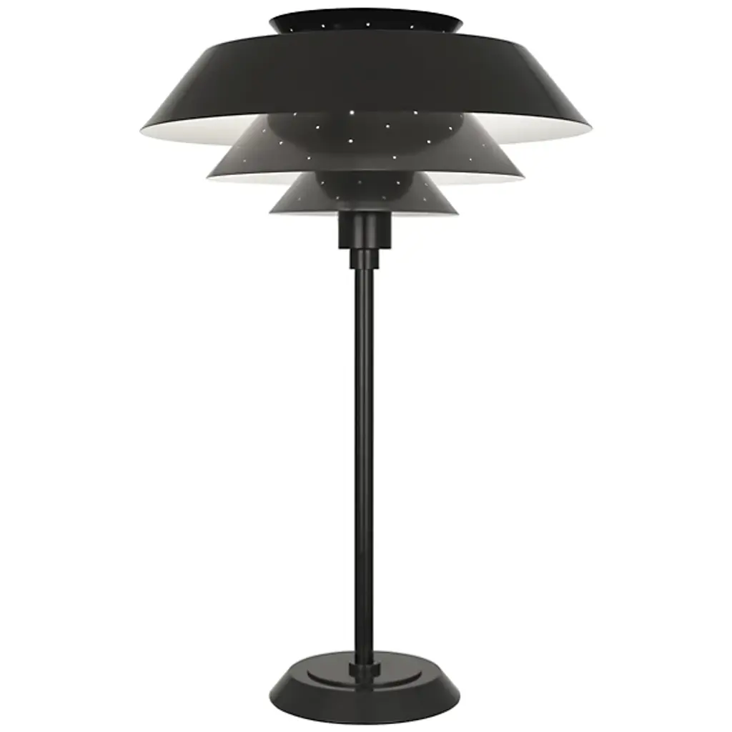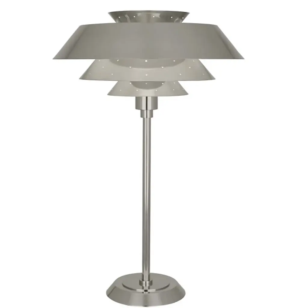 So smooth, yet so sharp. Over an end table or short cabinet, the Pierce Table Lamp from Robert Abbey works wonders presenting an intricate modern design that facilitates a stunningly layered glow. The all-metal design showcases a polish and a cohesive quality, beginning with its beveled circular base and its neat column. A brilliant composition of round, angular shades cascades from top to bottom, with its innermost segments detailed with snazzy perforations. A clean light from the center streams past the shades, in a refined, ambient glow.