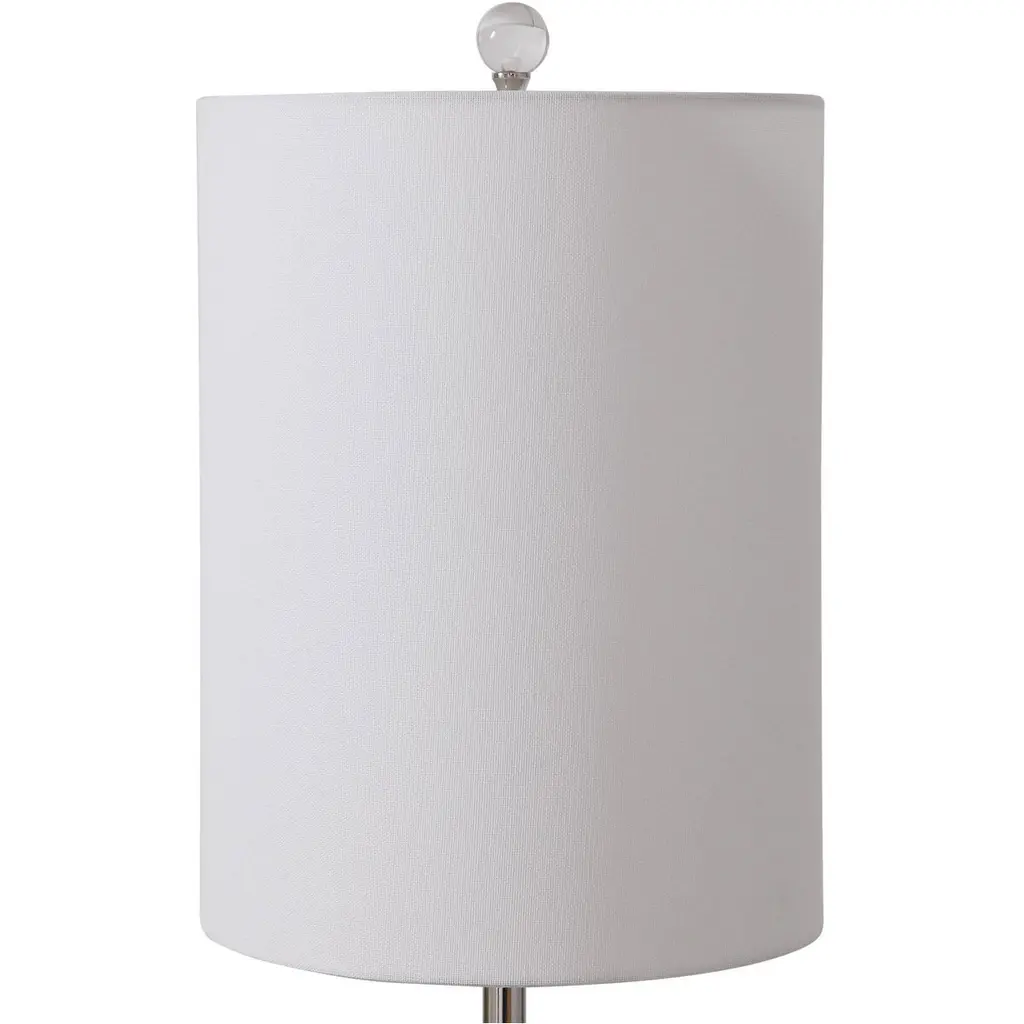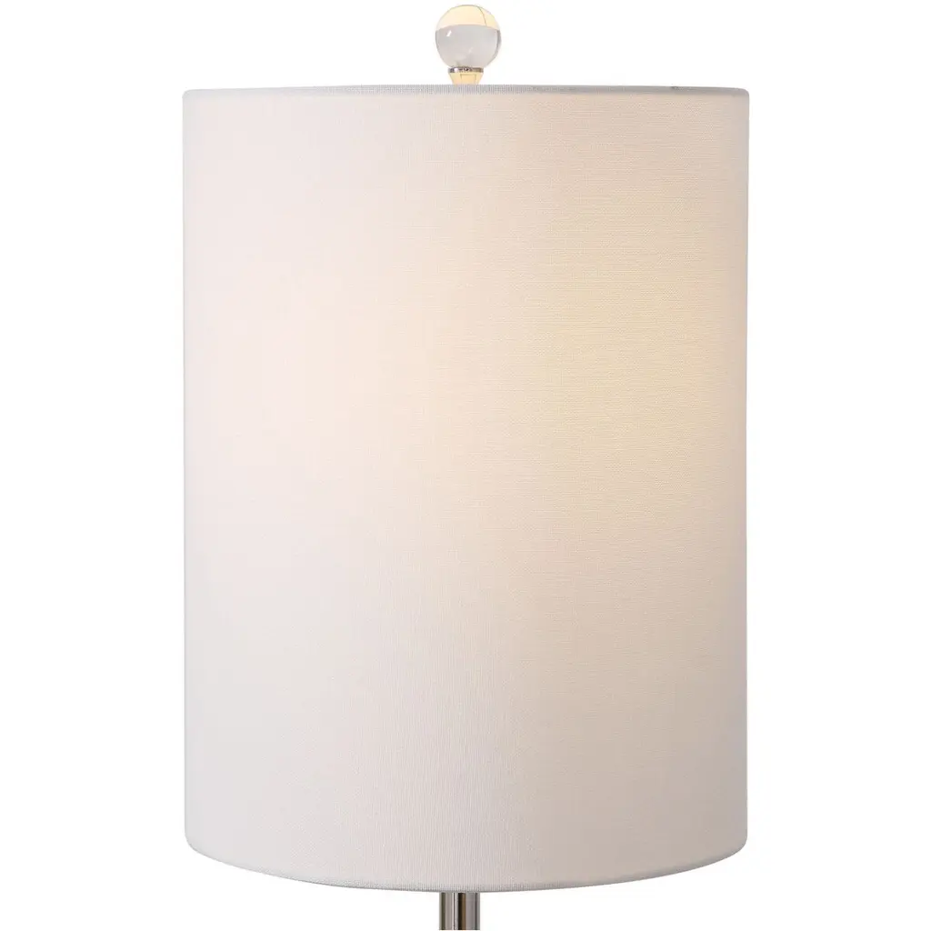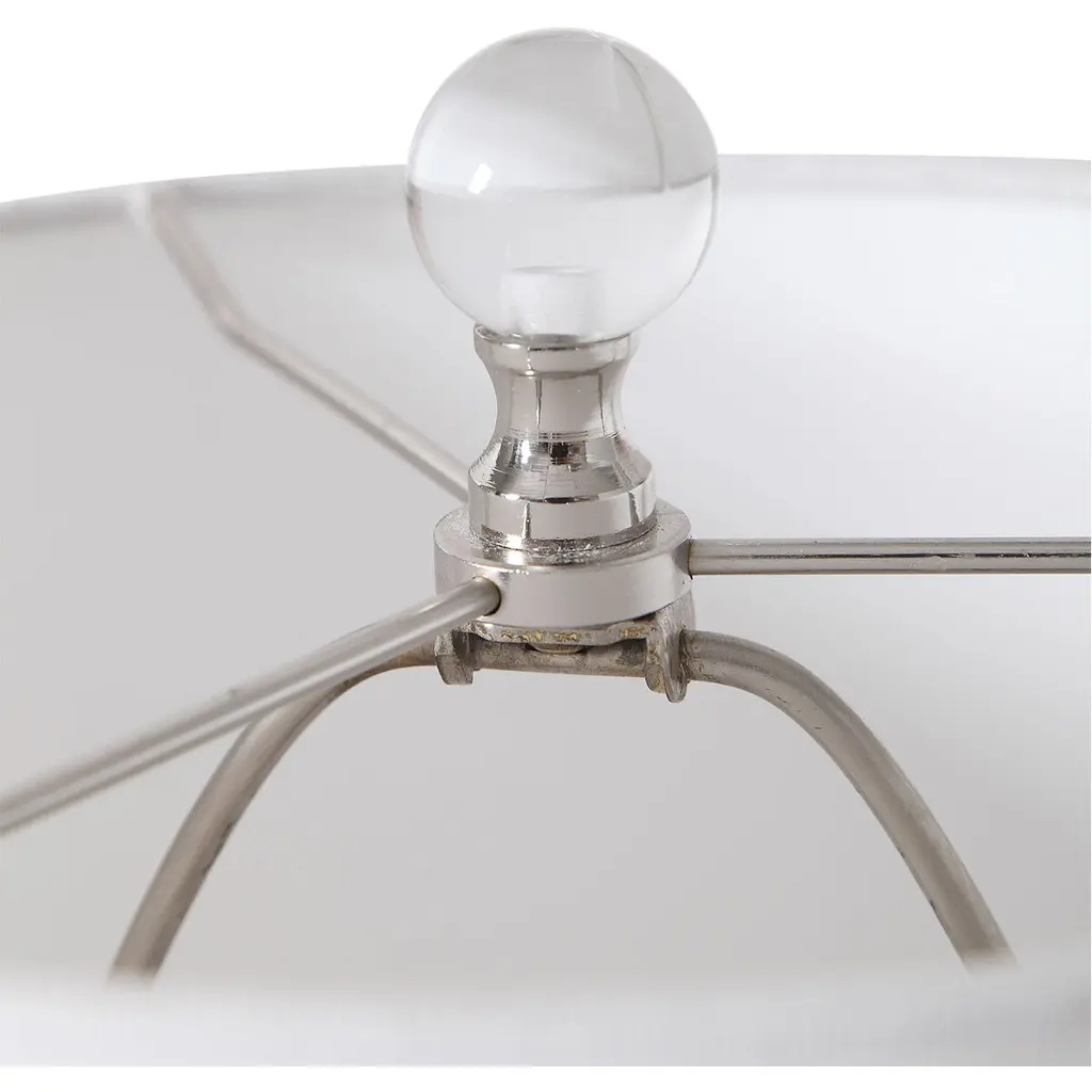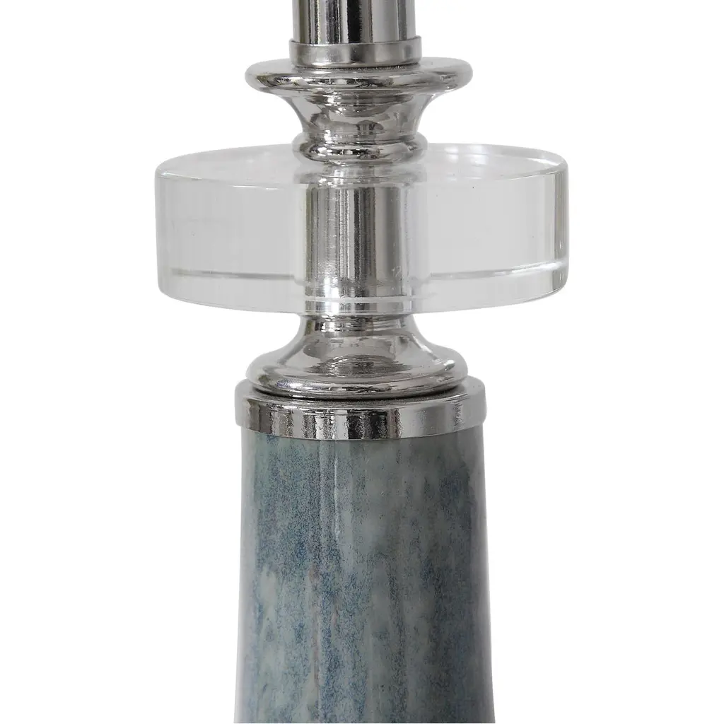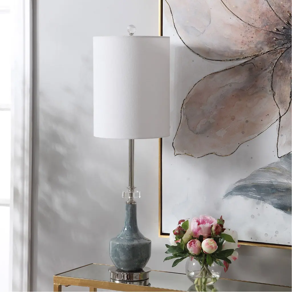 This Buffet Lamp Features A Ceramic Base Finished In A Mottled Blue Glaze With Subtle Rust Distressing. Polished Nickel Plated Details And Crystal Accents Compliment This Design. The Round Hardback Shade Is A White Linen Fabric.