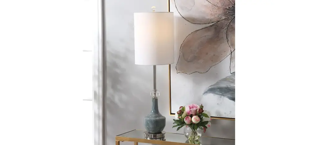 This buffet lamp features a ceramic base finished in a mottled blue glaze with subtle rust distressing. Polished nickel plated details and crystal accents compliment this design. The round hardback shade is a white linen fabric.