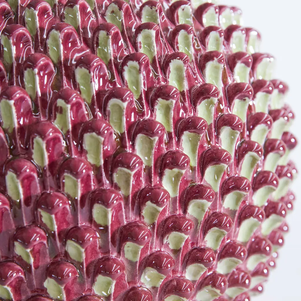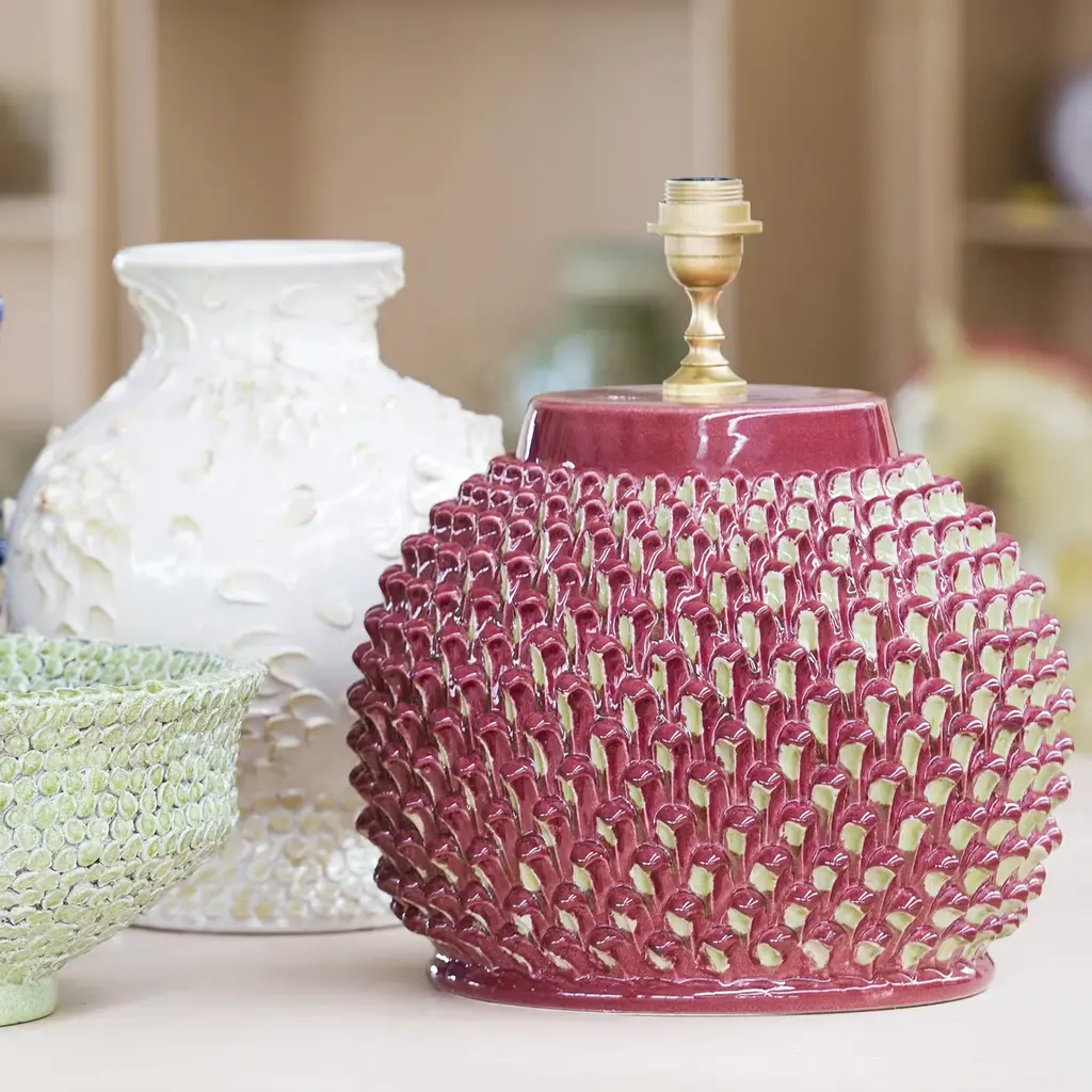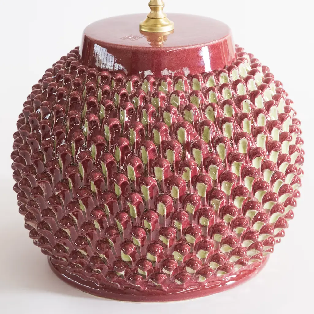 Traditional ceramic techniques and experimentation give life to this stunning maiolica table lamp by Tuscan ceramic workshop ND Dolfi. The intricate pine cone design gives gorgeous texture to this fully-handcrafted piece in a rather dark shade of red mixed with ochre highlights. Lampshade not included, available on request.
