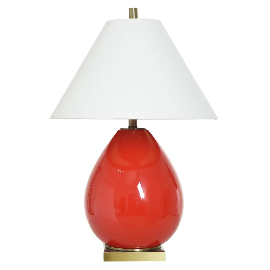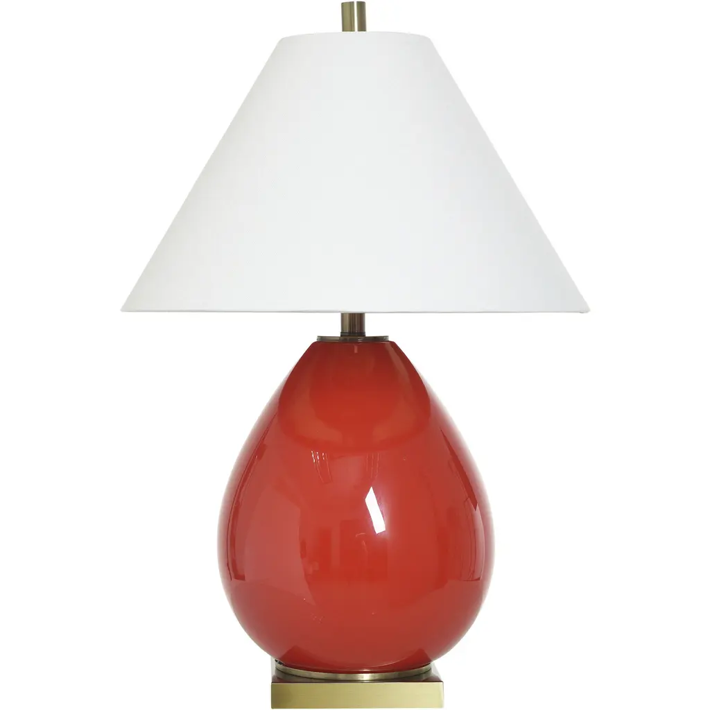 Ruby Red Pike Contemporary Table LampFeaturesNumber of bulb: 1Bulb type: AMax wattage: 150WVoltage: 120VSocket: Medium Aluminum Sheet E26Switch: Hi-LoSwitch location: SocketFinish: Ruby Red Glazed Ceramic with Aged Brass AccentsShade: Pearl Dupoini Fabric ShadeCord color: SilverUL listed: DryDimensionsShade dimensions: 18.5 inches top x 19.5 inches bottom x 11 inches down sideBase dimensions: 1.63 inches height x 8 inches width x 8 inches depth