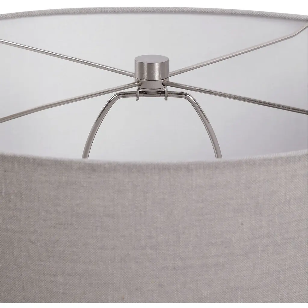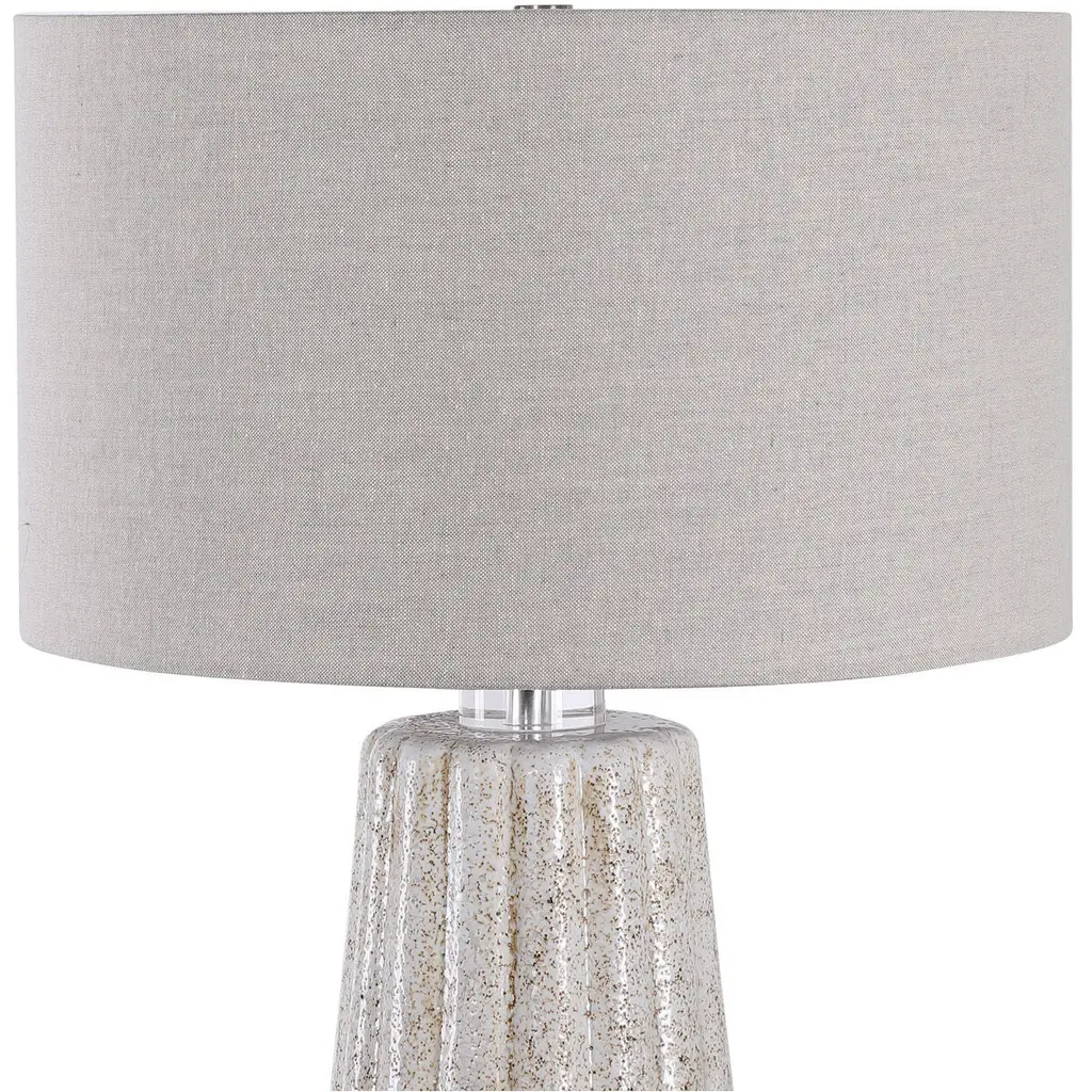 This Ceramic Table Lamp Features A Fluted Design With A Porous Texture Finished In A Stone-ivory And Taupe Glaze, Accented With Brushed Nickel Plated Details And A Thick Crystal Collar. A Light Gray Fabric Drum Shade Completes The Look.